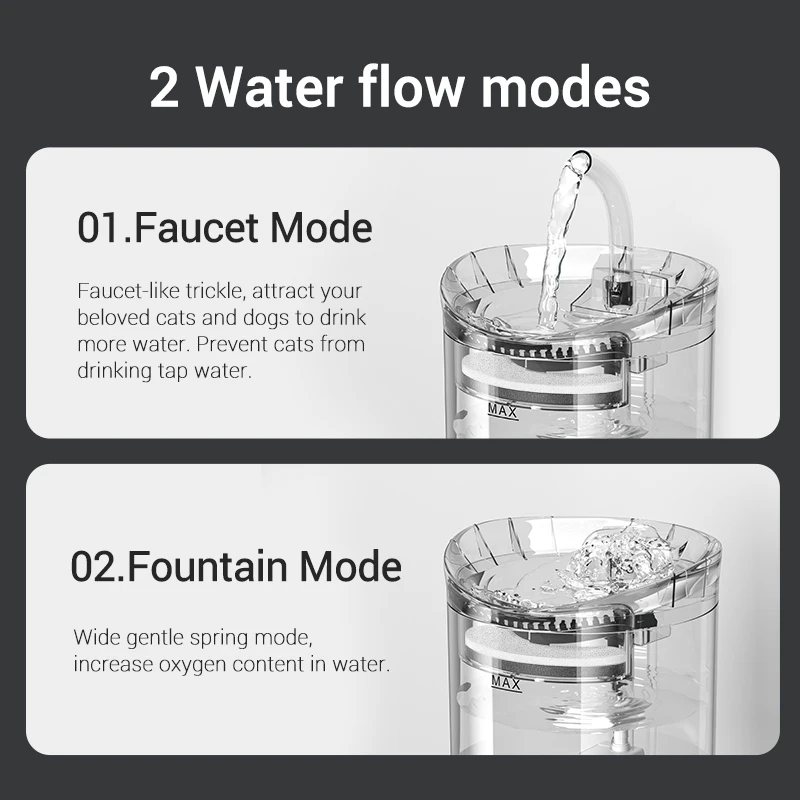 2 режима потока воды (режим крана/режим фонтана), обеспечивая чистую проточную воду, сделайте ваших питомцев счастливее и здоровее.