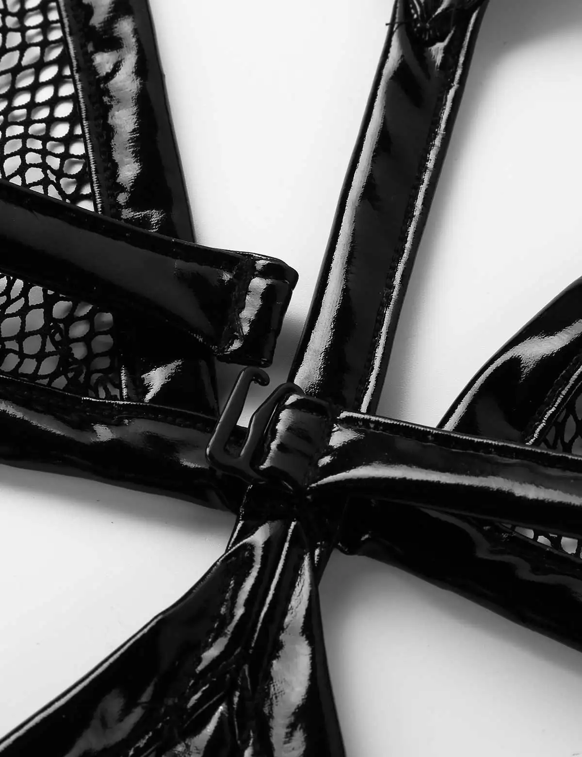 Женские сетчатые чашки с лямкой на шее, женский трико из лакированной кожи с высоким вырезом и застежкой-молнией