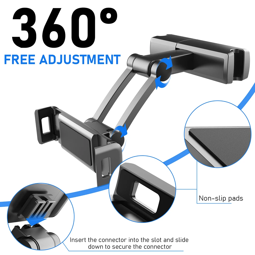2. [Поворот на 360 ° и регулировка угла]: заднее сиденье кронштейна для планшетного компьютера с автомобильным креплением имеет 360 градусов, а угол вверх и вниз можно регулировать под удобным углом. Используйте наш кронштейн заднего сиденья автомобиля, чтобы насладиться путешествием.