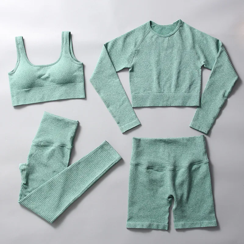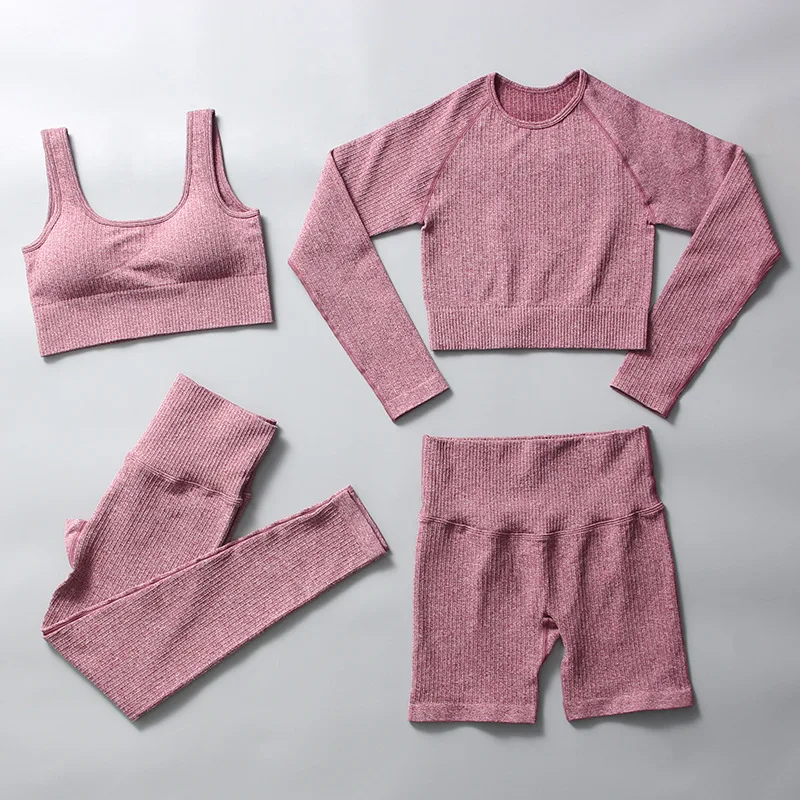 Комплект для йоги из 4 предметов, бесшовный Комплект Фитнес в рубчи...
