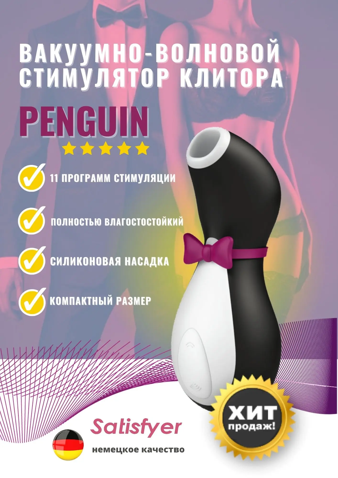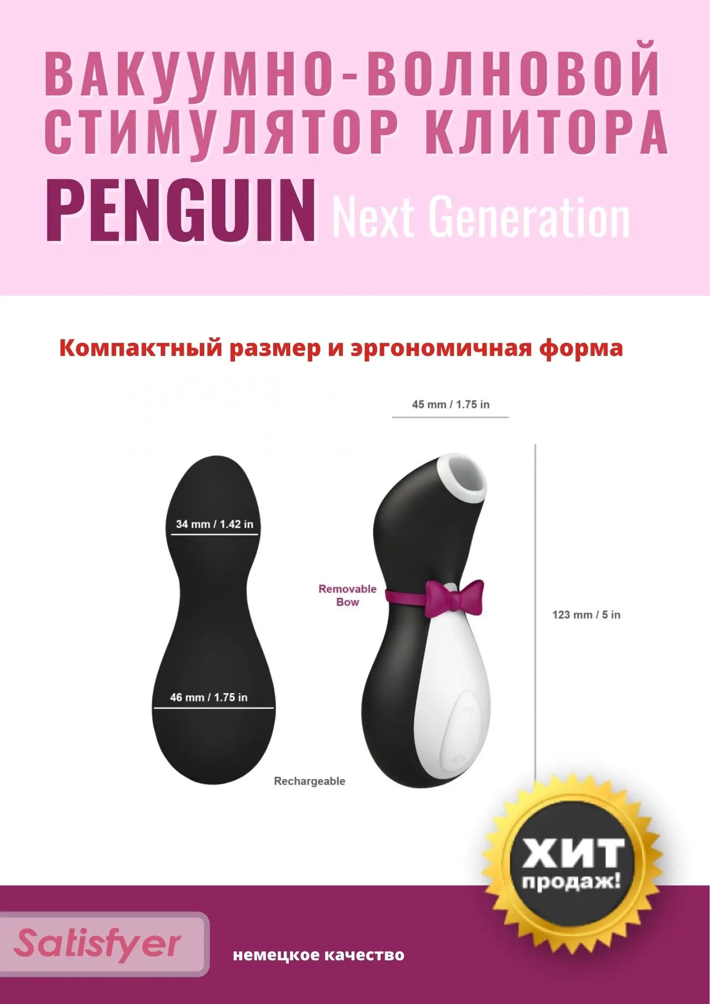 Пожалуй, самая стильная игрушка в серии Satisfyer — это Satisfyer Penguin. Одетый в элегантный фрак, этот искуситель просто ждет, когда ты пригласишь его на свидание для двоих, и он побалует тебя волнующей вакуумной стимуляцией вплоть до взрывного оргазма. 11 уровней интенсивности позволяют выбрать любую стимуляцию клитора, от нежной до интенсивной, и ввергнут тебя в легкую или заметную дрожь — в зависимости от твоего настроения. Благодаря бесшумному двигателю ты можешь без колебаний использовать его даже при посторонних слушателях в соседней комнате. Satisfyer Penguin имеет водонепроницаемое исполнение, поэтому для удобства его можно брать с собой в ванну или душ. Улучшенные кнопки позволяют легко переключать уровни интенсивности, даря горячие волны возбуждения и удовольствия независимо от того, где ты находишься и в каком настроении.