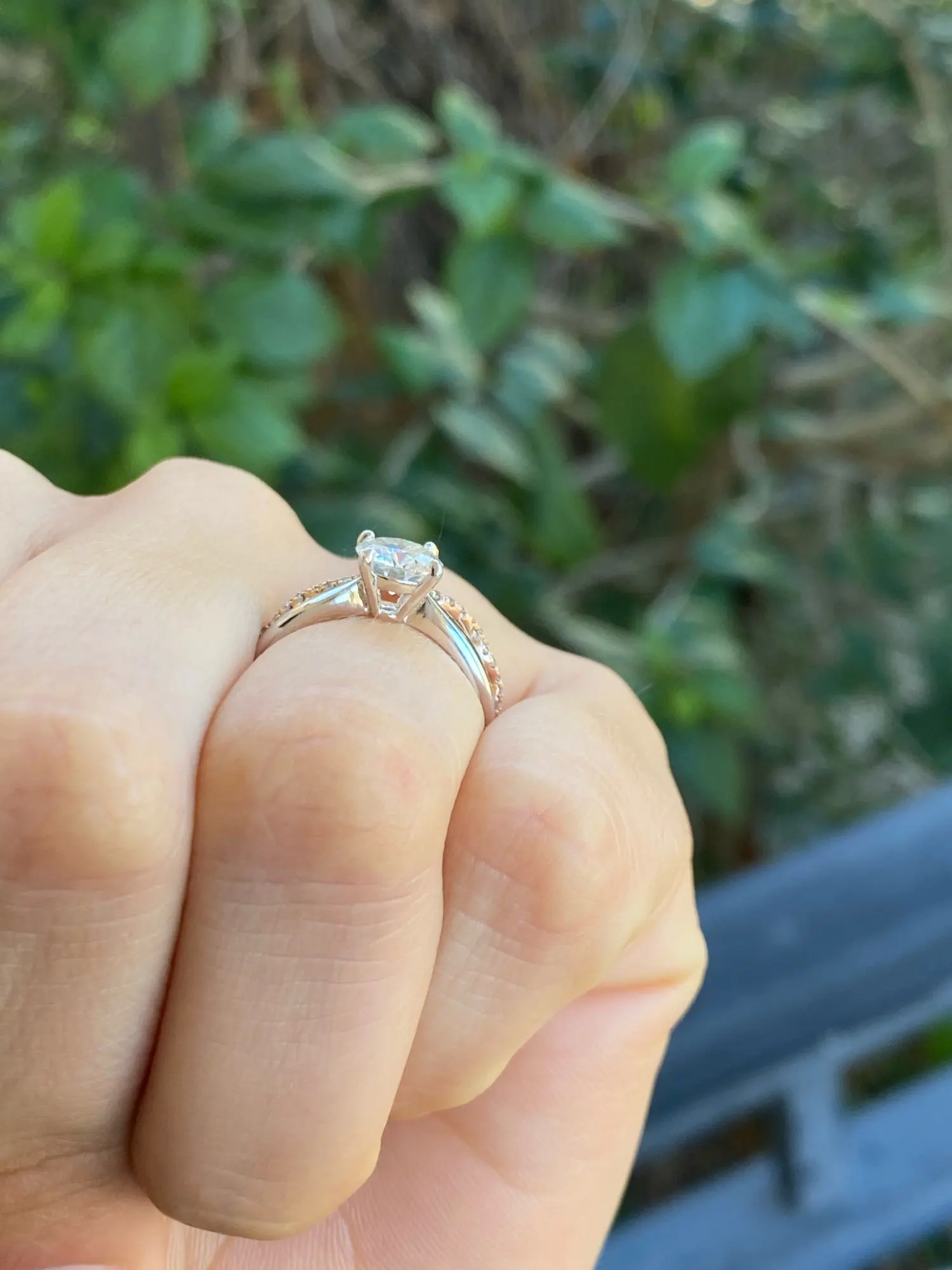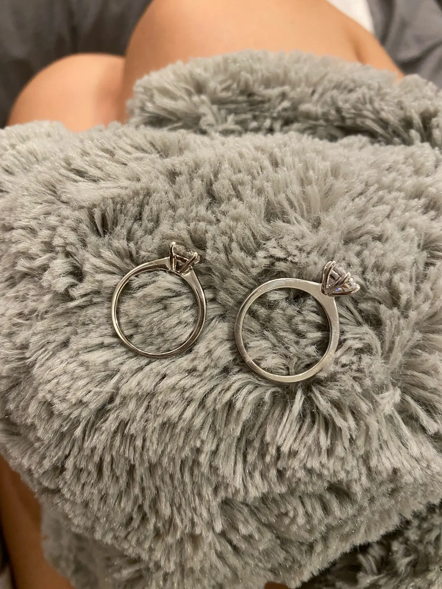1ct кольцо. Очень тонкий, особенно сзади. Камень 6,5 мм и очень сверкающий, имеет бриллиантовый вид и не выглядит дешево. Дизайн кольца с другой стороны выглядит дешевле, а задняя сторона выглядит немного трясинкой, как брелок. На картинке с 3 кольцами это верх и на сером фоне это левый. Сертификат кажется поддельным, так как у всех tgey одинаковые характеристики независимо от того, карат. Разница только в размере карата и количестве отчетов