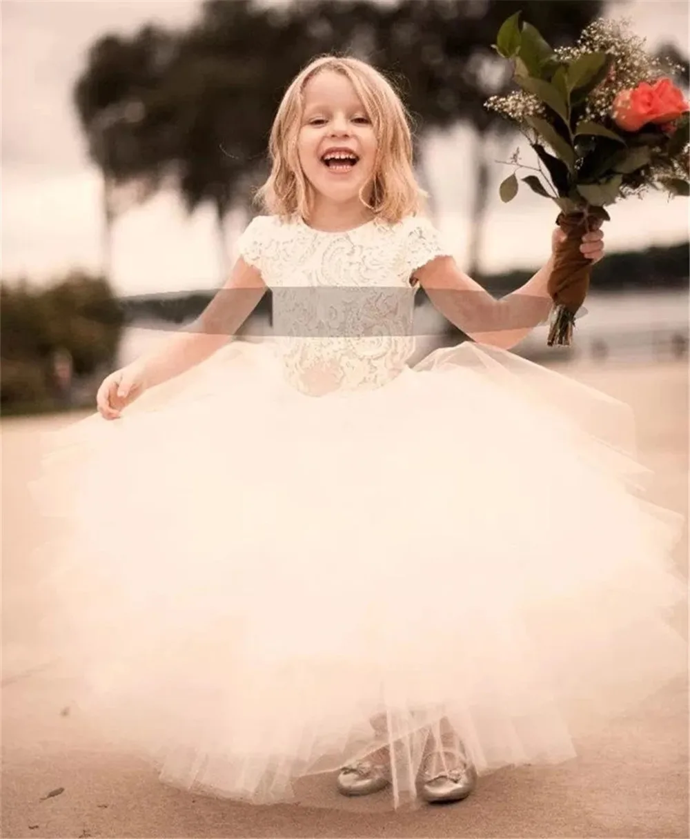 Кружевное и Тюлевое платье для девочки цвета слоновой кости с цветочным принтом для свадьбы, юбка-пачка с коротким рукавом и поясом, Детская официальная одежда, платья для девочек на заказ