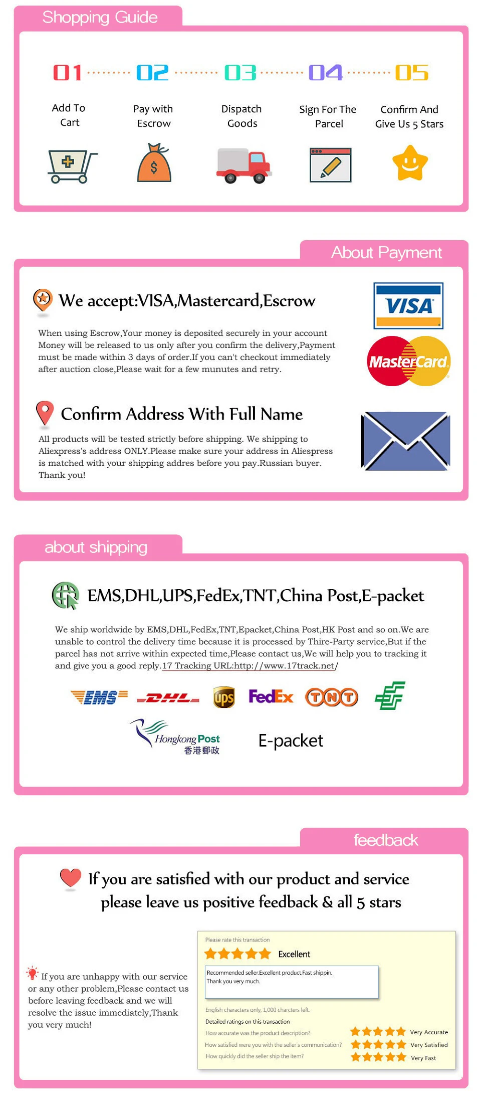 1.Доставка по всему миру.(За исключением некоторых стран и армейской почтовой службы/почтовых отделений флота)2. Заказы обрабатываются своевременно после подтверждения оплаты.3. Мы осуществляем доставку только по подтвержденным адресам заказа. Адрес Вашего заказа должен совпадать с адресом доставки.4. Представленные изображения не являются реальным товаром и предназначены только для справки.5. Время доставки определяется перевозчиком и не включает выходные и праздничные дни. Время доставки может меняться, особенно во время праздников.6. Если вы не получили свой заказ через 30 дней с момента оплаты, пожалуйста, свяжитесь с нами. Мы отследим ваш заказ и свяжемся с вами в ближайшее время. Наша цель – удовлетворение клиентов!7. Срок поставки: