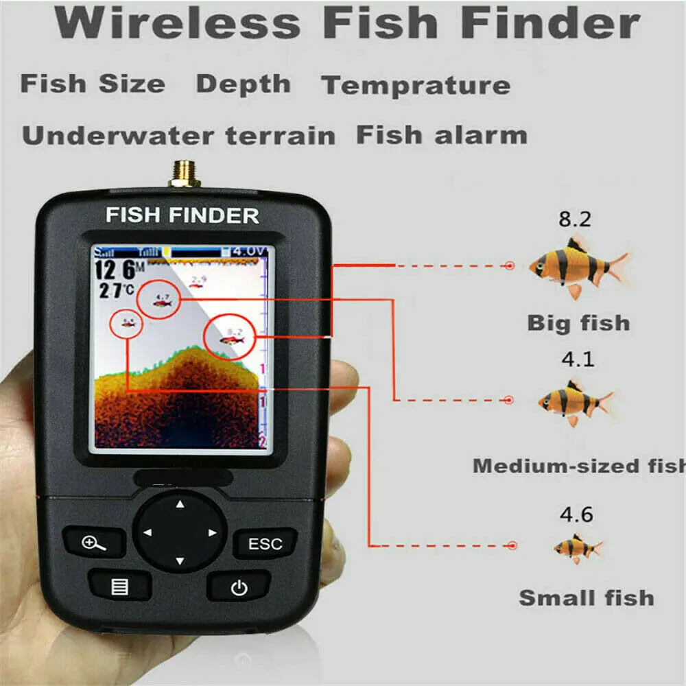 Данное устройство оснащено акустической частотной системой с ЖК-экраном для мощной производительности до 120 футов.Звуковой сигнал о глубине и глубине, глубина от 2 футов до 120 футов.Компактный, легкий и портативный, чтобы хорошо поместиться в кармане.Используется для рыбалки на лодках, рыбалки на платформе, дальней рыбалки и ледовой рыбалки.100m/328ft безпроводная работа, 45m/147ft глубина.Угол луча 90 градусов в 125 кГц (без провода).Провод-меньше, не более длинный и тяжелый кабель для преобразователя.Характеристики:Батареи: 4 * AAA батареи (не включены)Силы: 0,1 WГлубина: 2-120 футовБеспроводная работа: 100 мЧастота гидролокатора: 125 кГцУгол луча гидролокатора: 90 градусовРадиочастота: 433,92 МГцРабочая температура: -20 ~ + 70 °CРазмер изделия: 125*72*30 мм/4,92*2,83*1,18 дюймовВес изделия: 205 г/7,23 унцийРазмер посылка: 250*110*80 мм/9,84*4,33*3,15 дюймовВес посылка: 350 г/14,11 унцийПримечание:В датчике гидролокатора есть два небольших отверстия (гидролокатор x), с помощью нити два отверстия можно привязать к лодке с дистанционным управлением или ночному стационарному поплавковому режиму или использовать для вращенияЭтот товар не подходит для детей в возрасте до 14 лет.Пожалуйста, внимательно прочитайте введение перед началом работы.