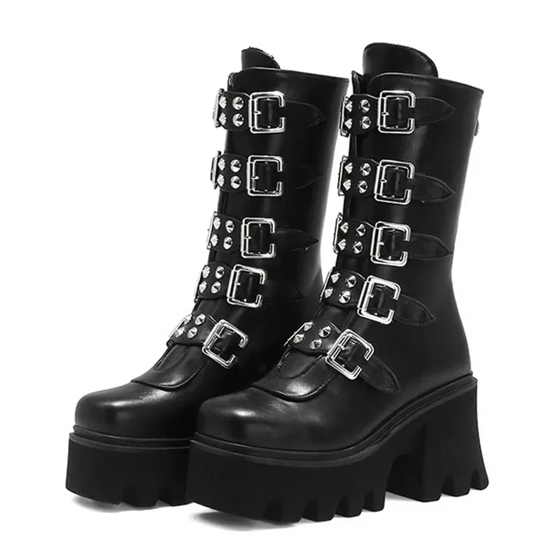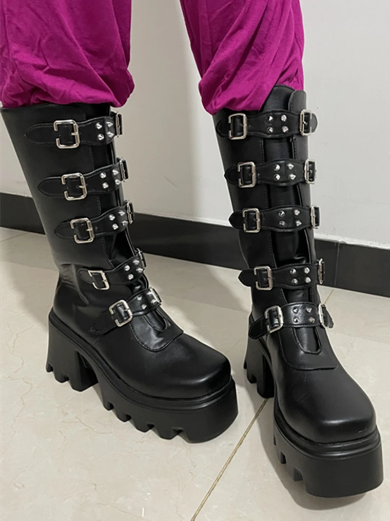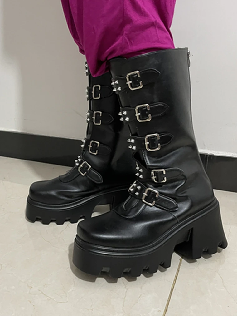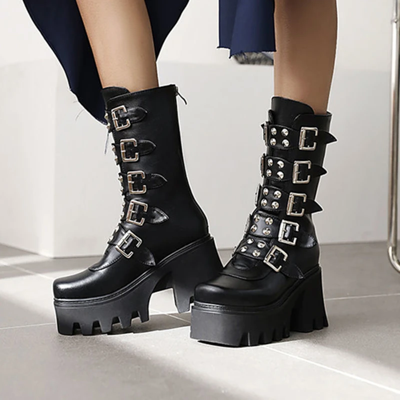 Женские ботинки в готическом стиле, черные ботинки на платформе, до середины икры, на молнии, с пряжкой, на ремешке