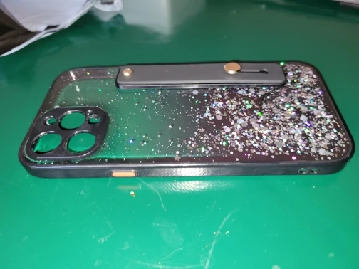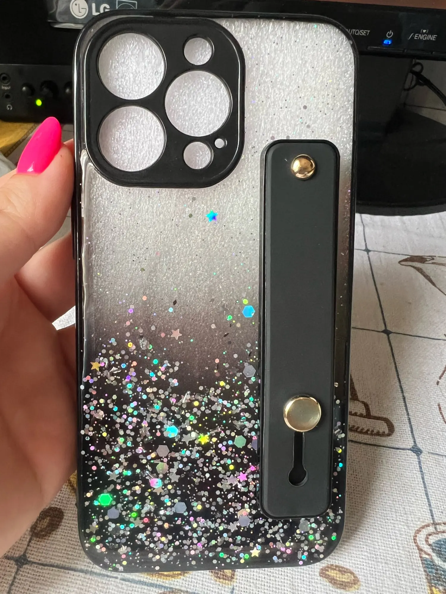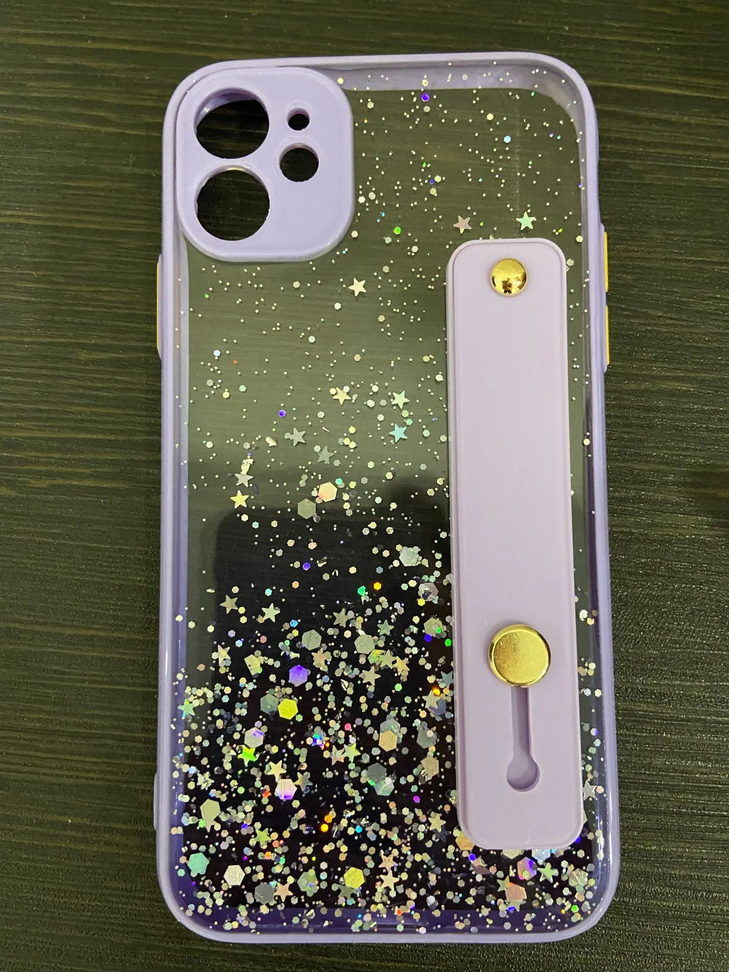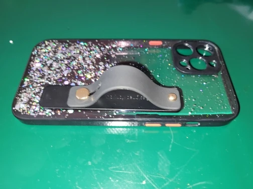Хороший чехол, но держатель слишком маленький и не совсем удобный. В прозрачной части впечатан когда то живой комар темного цвета и среди блёсток теперь парк юрского периода