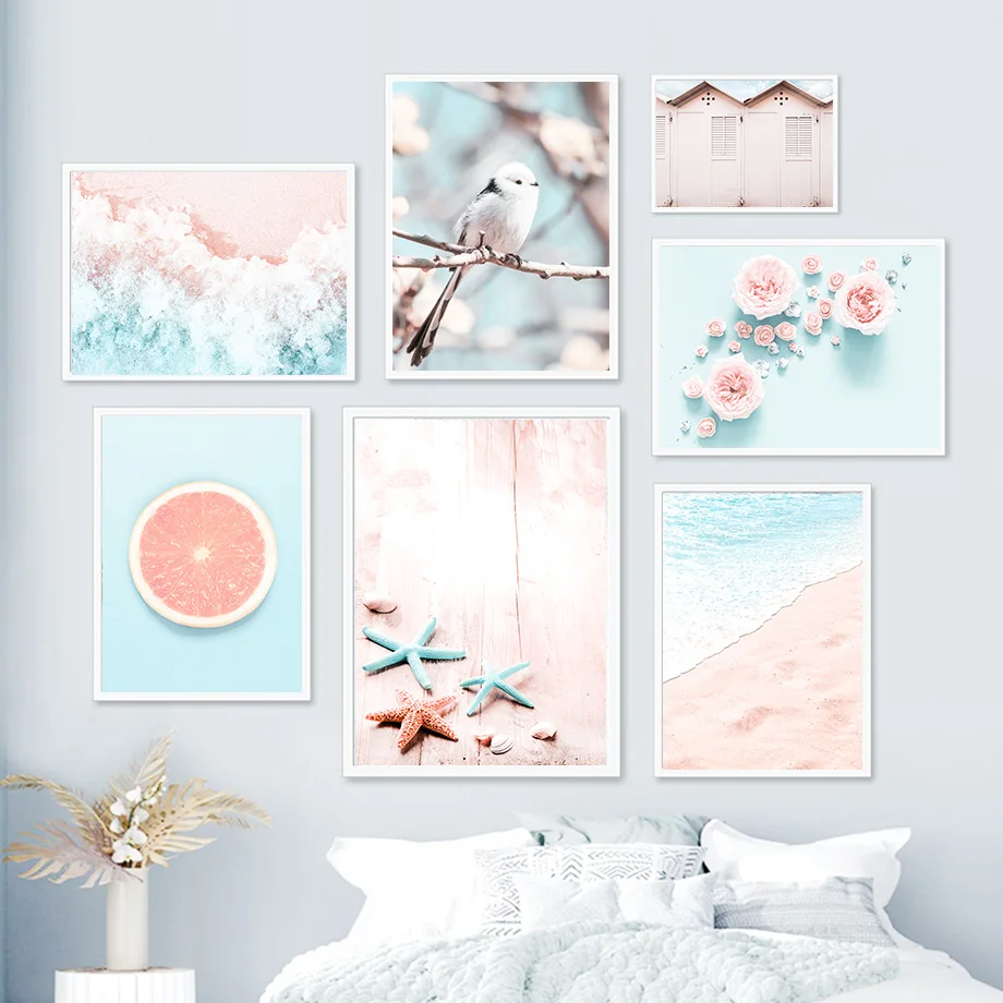 Розовые пляжные морские волны цветок сок пончик настенная живопись ...