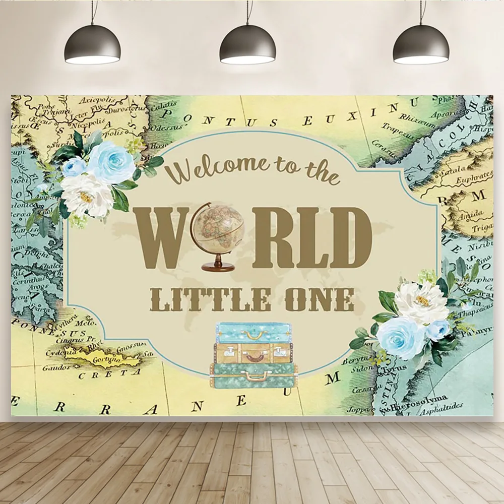 Добро пожаловать в путешествие по всему миру фотография Фон детский день рождения Декор Фон цветы чемодан карта мира фото