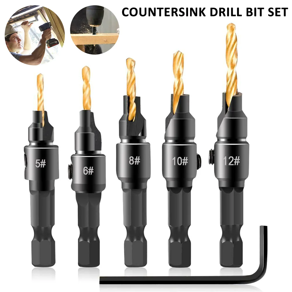 Набор сверл для зенковки по дереву, 5 шт., регулируемая глубина, прочная быстрая замена, коническое сверло из быстрорежущей стали, ручной инструмент