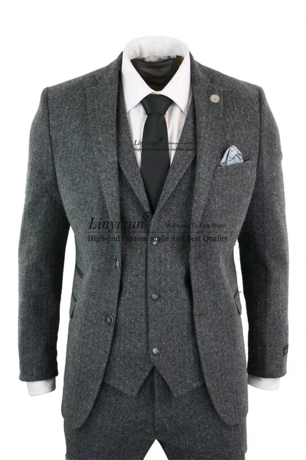 Костюм для жениха из серой шерсти в елочку, свадебный смокинг с лацканами, деловые мужские костюмы с отложным воротником, комплект из трех предметов, мужской пиджак + жилет + брюки