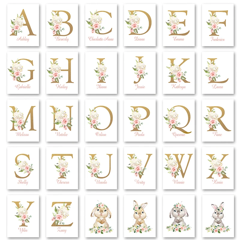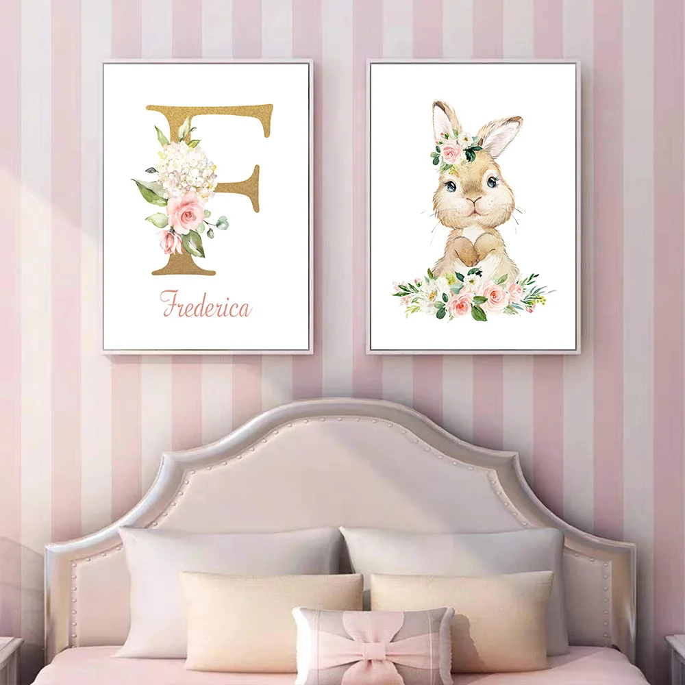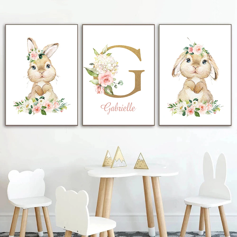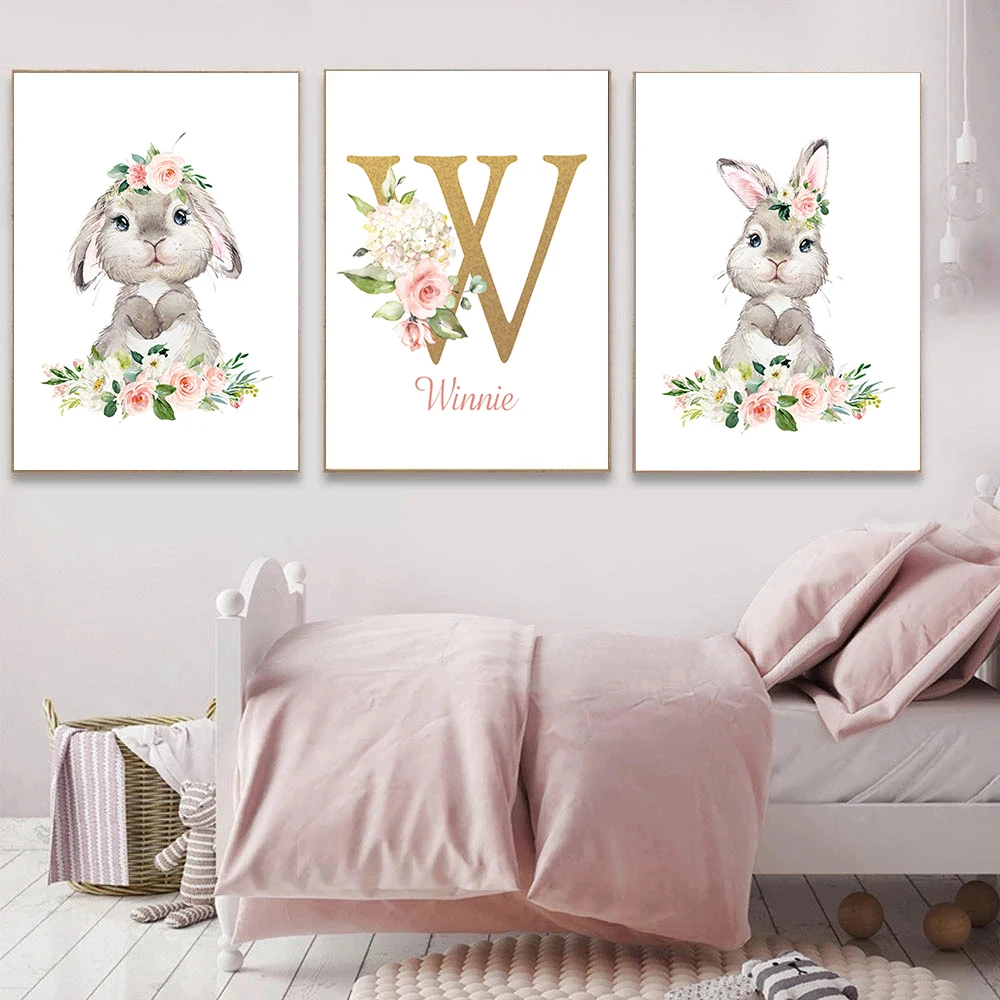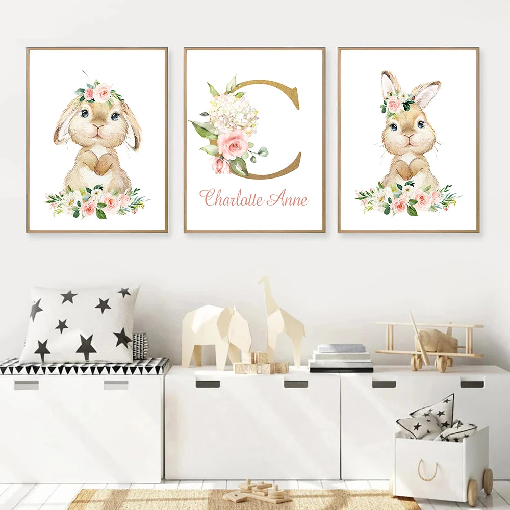 Настенный постер с именем ребенка на заказ, персонализированная детская Настенная картина с изображением цветка, серого кролика, на холсте, для девушек, спальни, цветочные картины