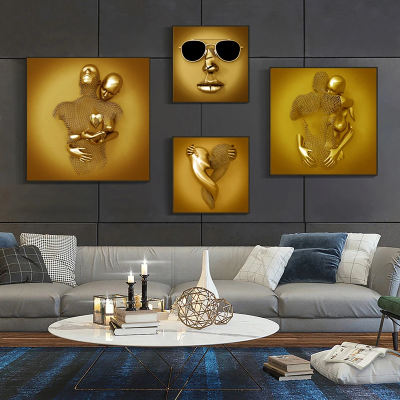 Золотые романтические постеры и принты для влюбленных, металлическая статуя, Художественная Картина на холсте, настенные картины, современный декор для гостиной