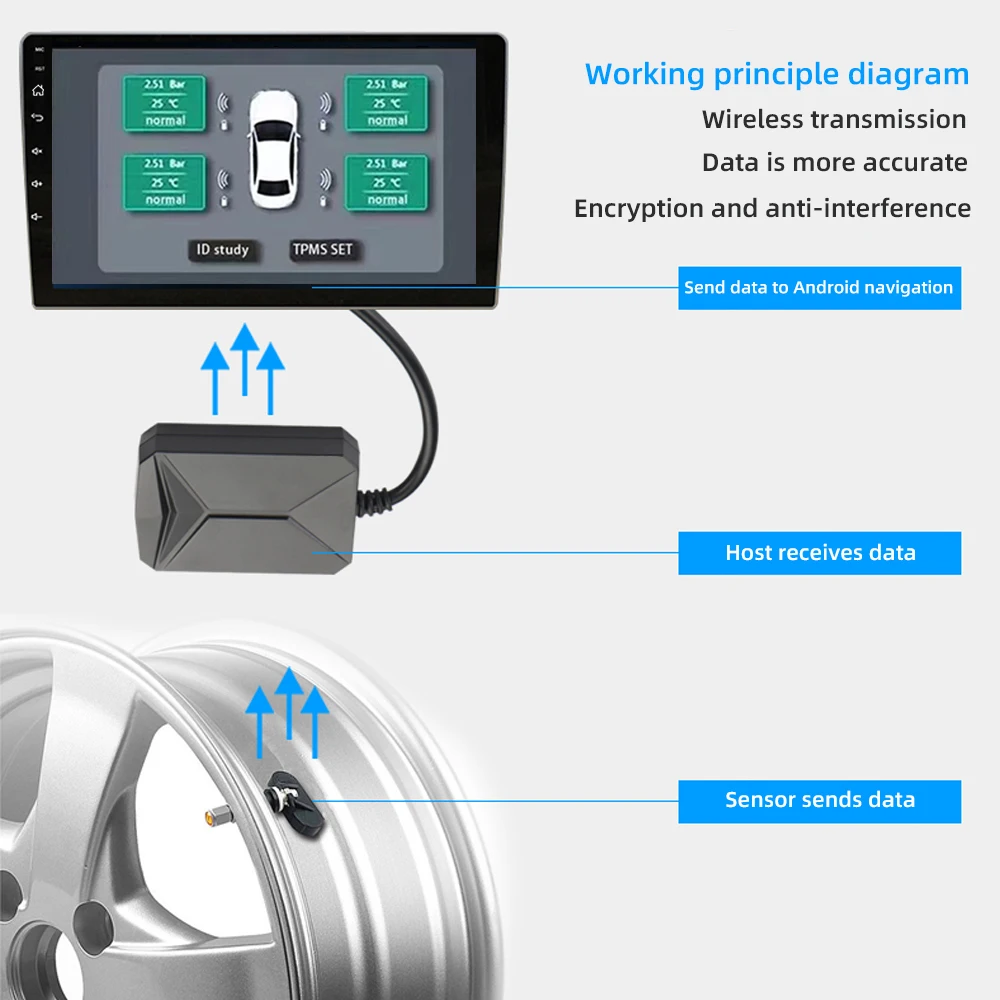Система мониторинга давления в шинах, 4 внешних датчика, USB, Android, TPMS