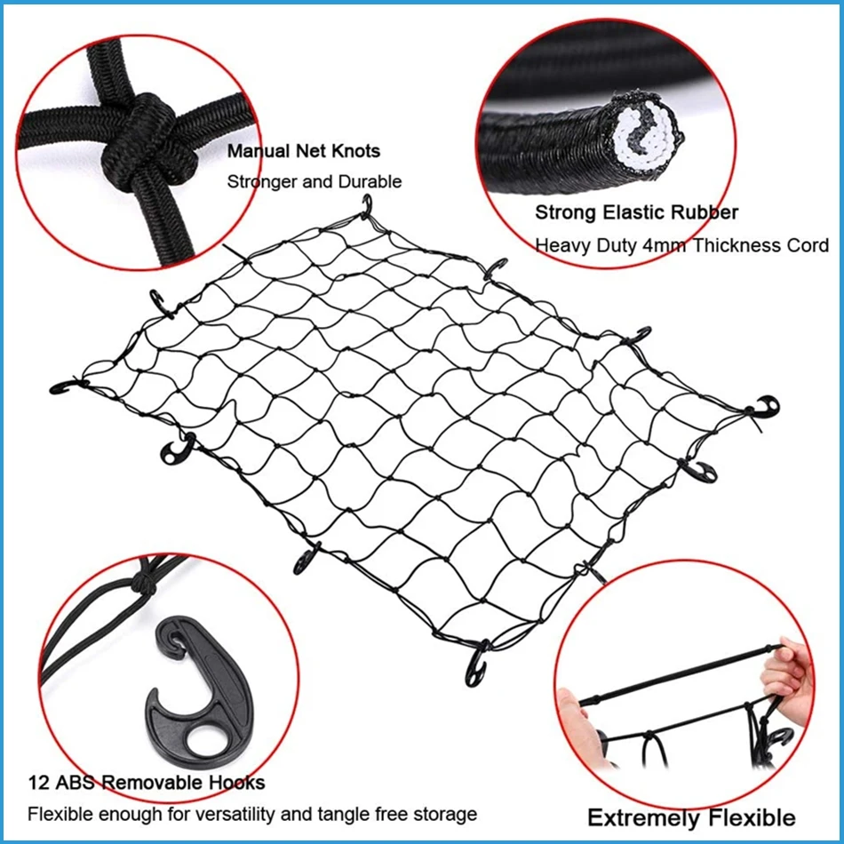 -Эластичная сетка для багажника на крышу с возможностью масштабирования может растягиваться от 3x4 до 6x8.-автомобиль сеть для крыши изготовлен из высококачественного толстого шнура 4 мм, Прочный и долговечный. -- Сетка 4x4 обладает большой прочностью и предотвращает выскальзывание мелких предметов, обеспечивая дополнительную прочность и защиту при растяжении на более крупные предметы. -- Сетка на крышу поставляется с 12 съемными крючками из АБС-пластика. Крючки можно перемещать из одной сетки в другую для быстрой регулировки затяжки, отлично подходят для управления и организации груза свободной, громоздкой или неуклюжей формы. Это просто и удобно.-конструкция с сетчатым узлом вручную делает его намного прочнее, чем пластиковый узел, способен выдерживать более тяжелый груз.