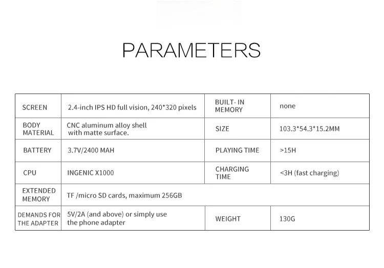 Экран: 2,4 дюйма IPS HD full vision, 240*320 пикселейВстроенная память: нетМатериал корпуса: корпус из алюминиевого сплава с ЧПУ с матовой поверхностью.Размер: 103,3*54,3*15,2 ммАккумулятор: 3,7 в/2400 мАчЦП: ингенный X1000Время игры:>15 чВремя зарядки:<3 ч (быстрая зарядка)Расширенная память: карты TF /micro SD, максимум 256 ГБТребования к адаптеру: 5 В/2 А (и выше) или просто используйте адаптер для телефонаВес: 130 г