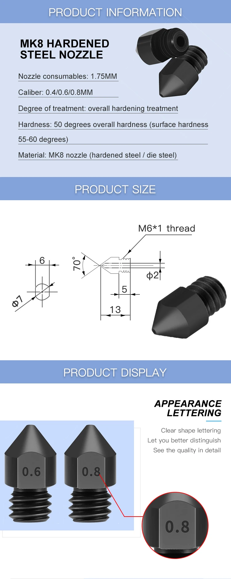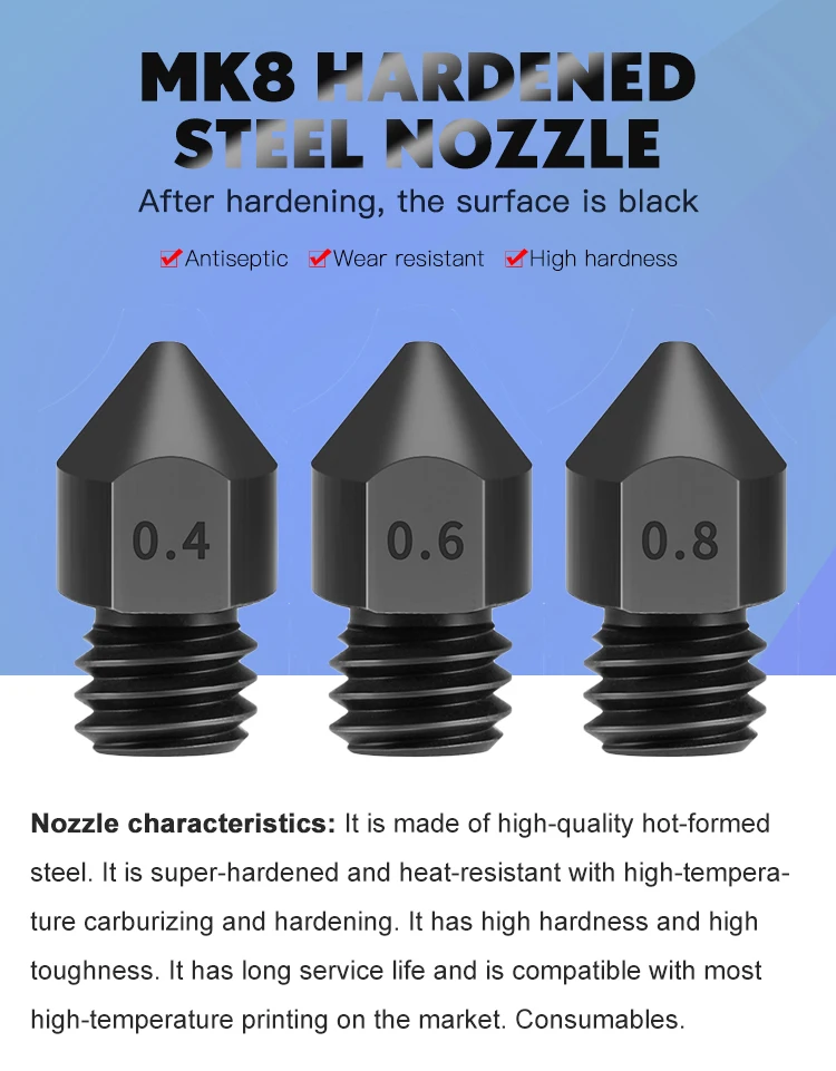 Номер модели: MK8/E3DОсобенности: Закаленная стальПрименение: 3d-печатьПосылка тация:1 сопло mk8/1 сопло E3D