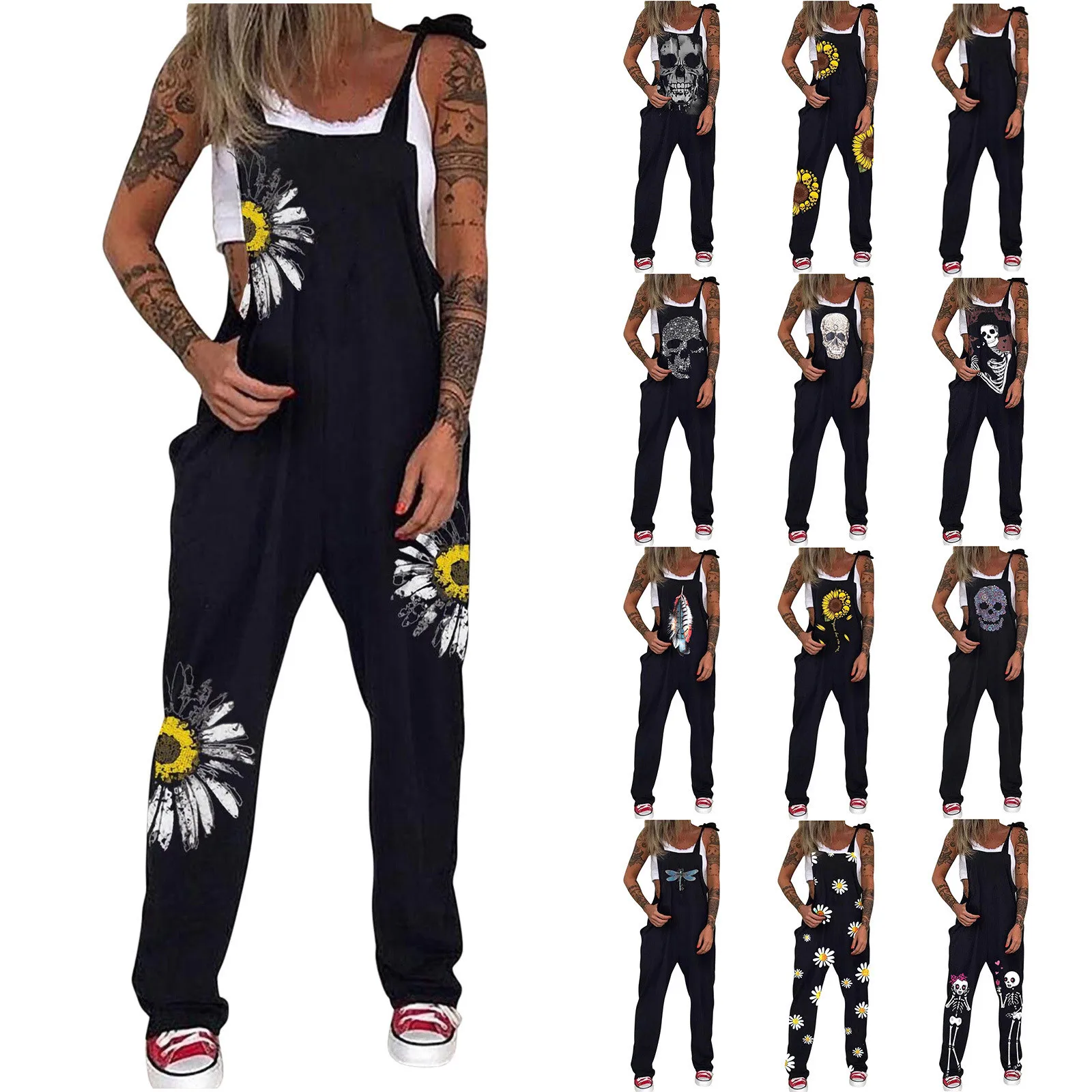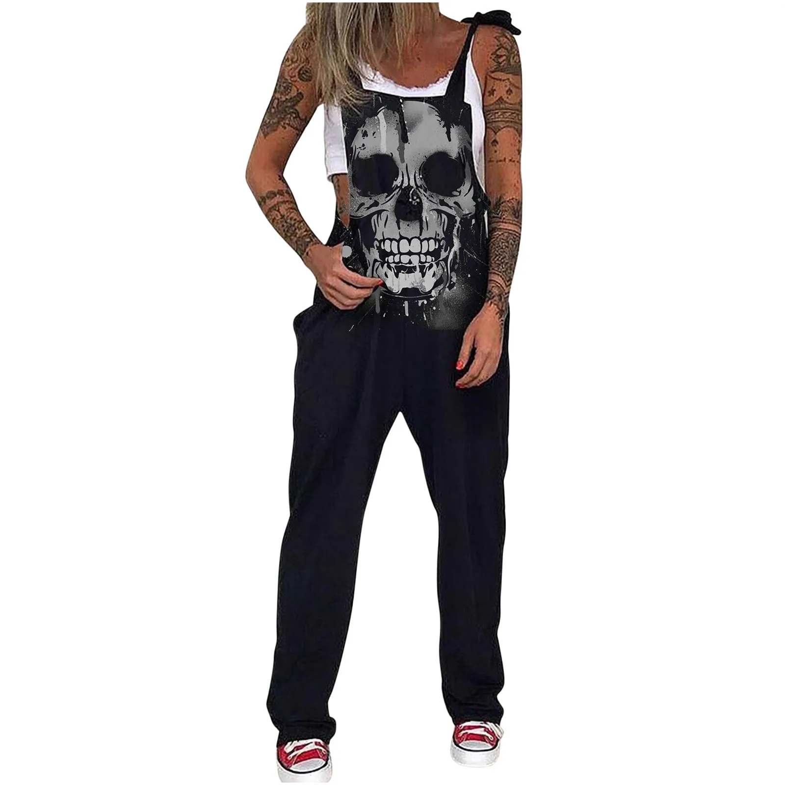 Женский комбинезон с принтом черепа, повседневный свободный комбинезоны, цельнокроеный винтажный комбинезон с широкими штанинами, Комбинезоны