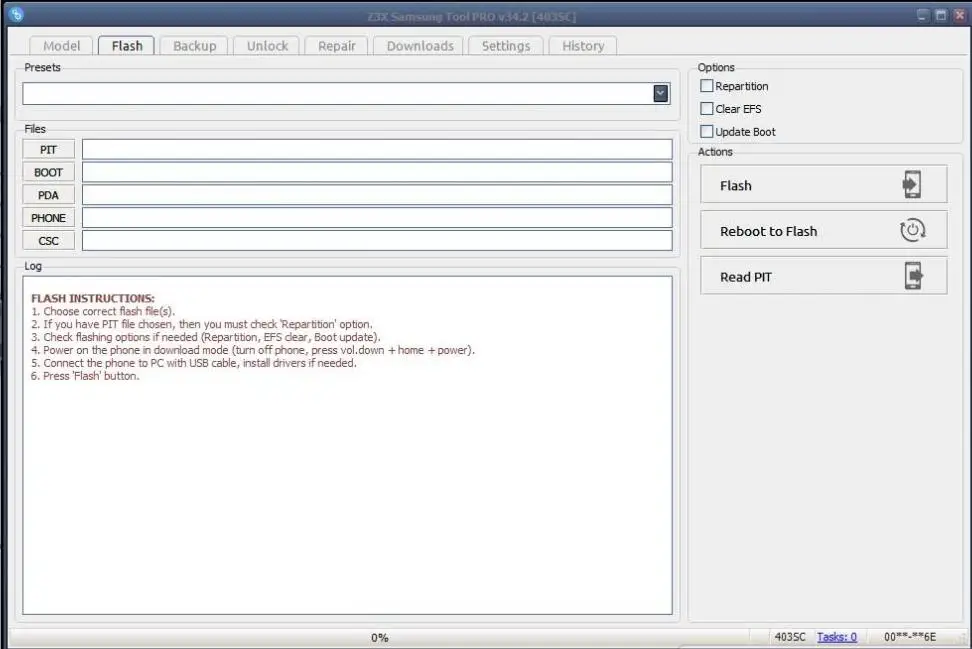 Стереть/загрузить/безопасно проверяет вспышку (метод OptiFlash не используется) для любого региона или всех вспышек