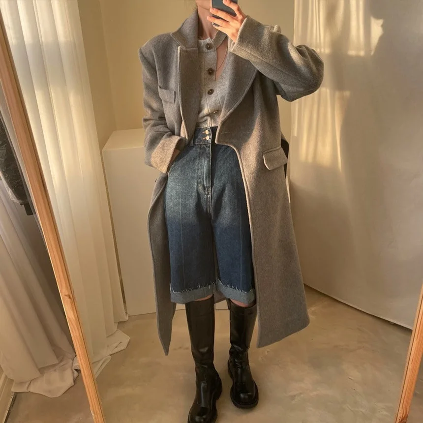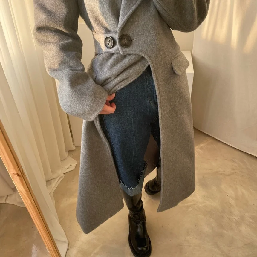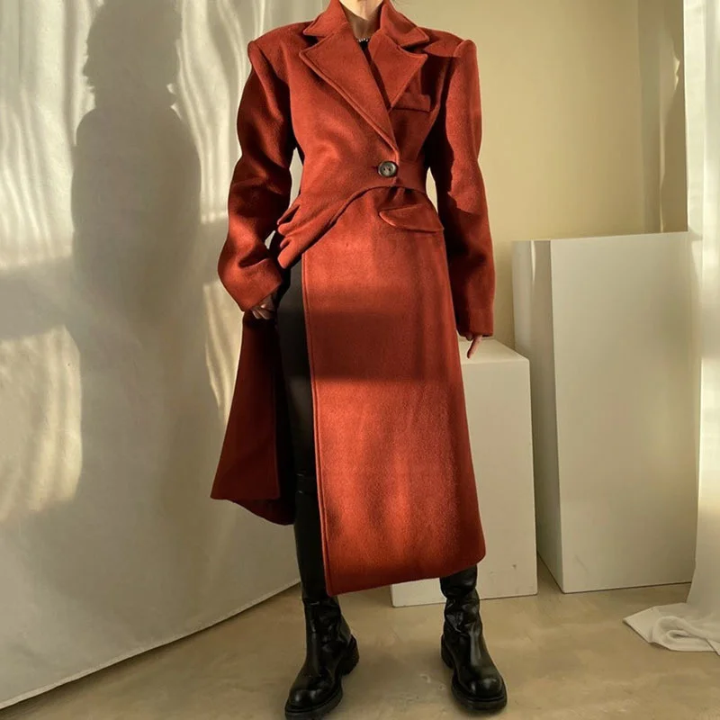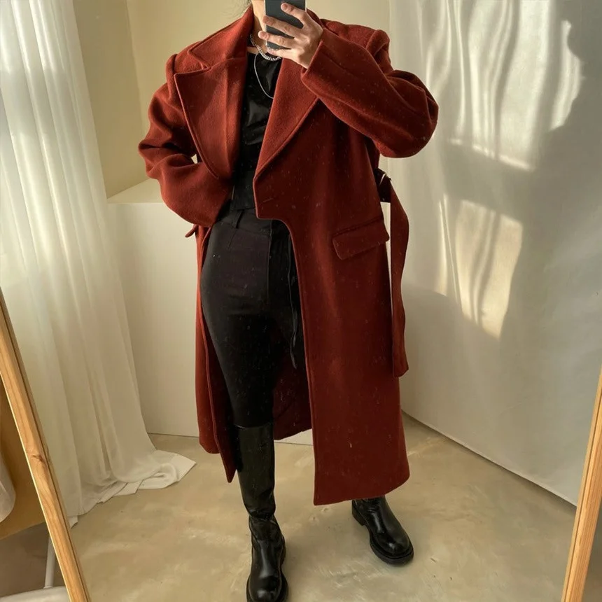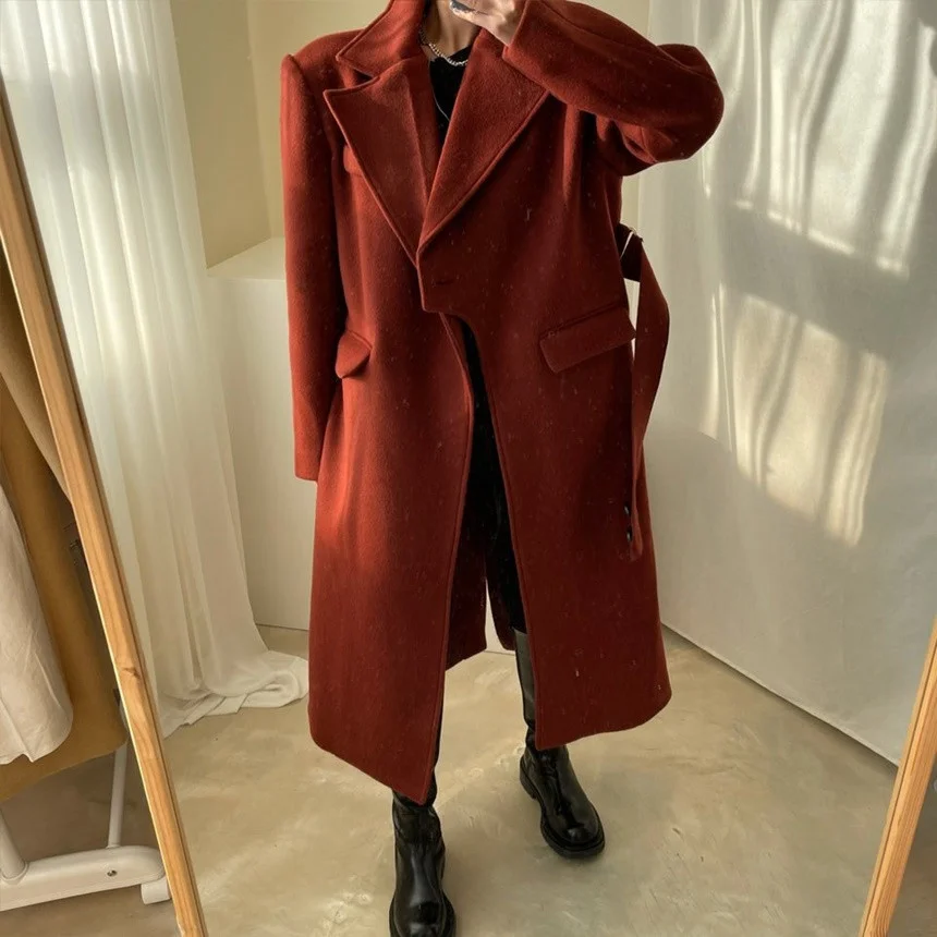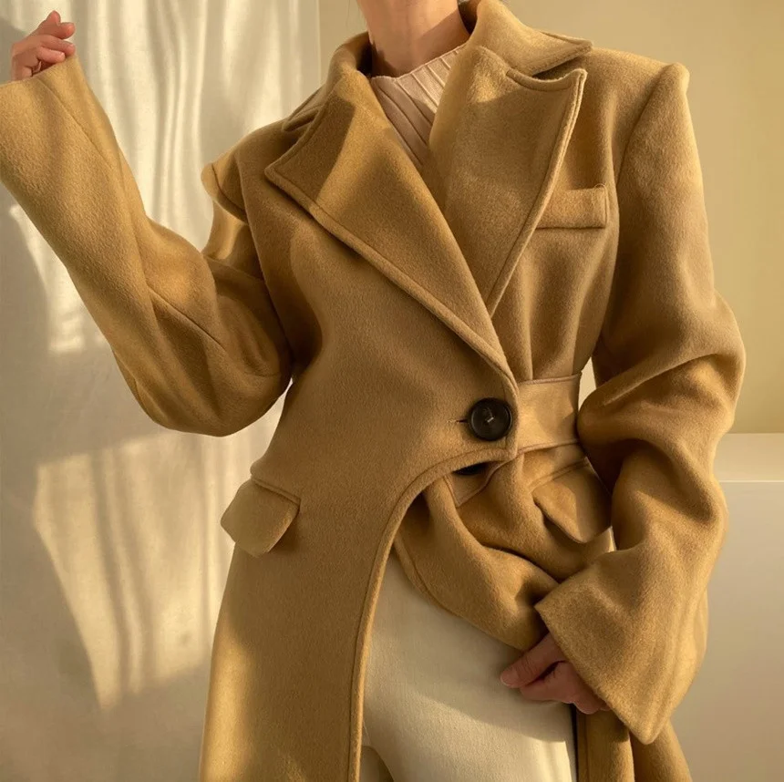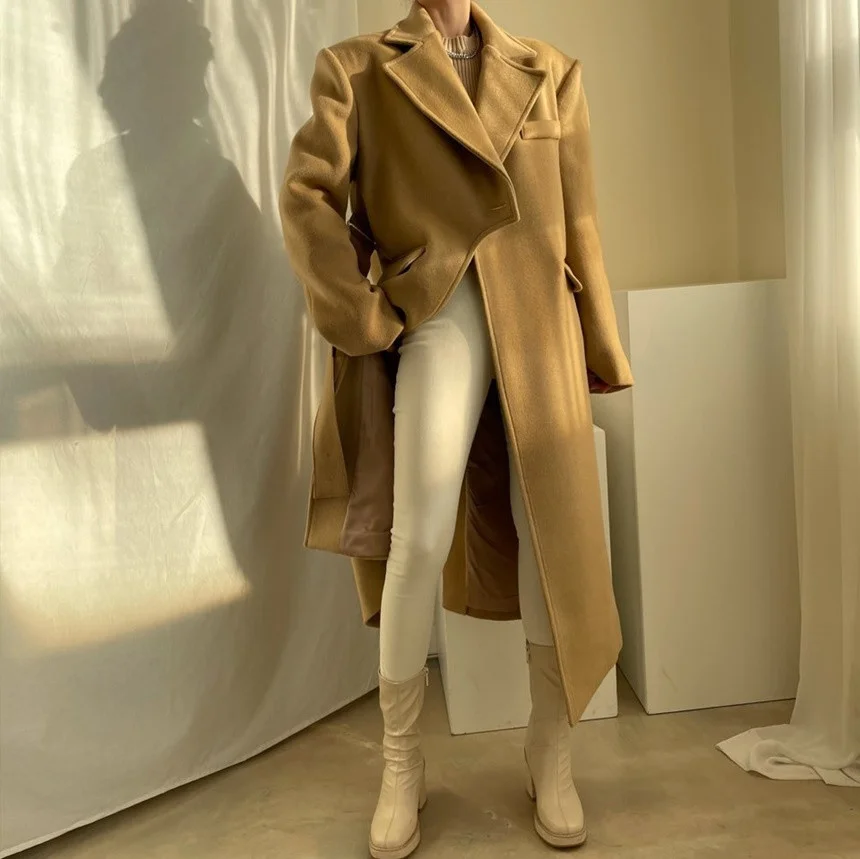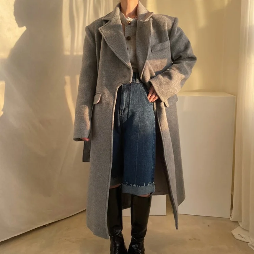 Женское шерстяное пальто с поясом EWQ, черное свободное асимметричное шерстяное пальто в Корейском стиле с отворотом и пряжкой, с пряжкой на талии, 5E29, весна-Зима 2022