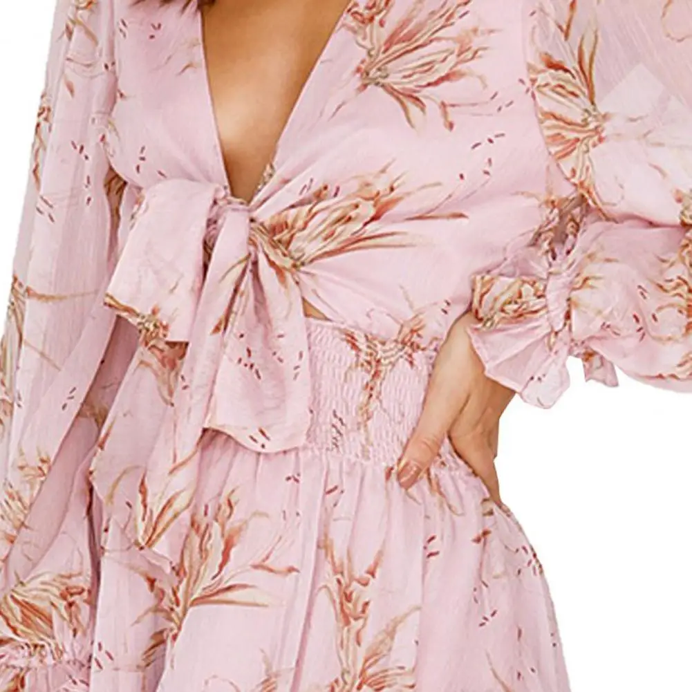 Женское шифоновое мини-платье, элегантное платье с цветочным принтом, оборками, длинным рукавом, глубоким V-образным вырезом, трапециевидного силуэта, для офиса, пляжной вечеринки