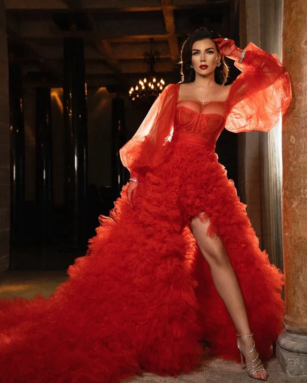 Женское платье из тюля, красное, пышное, с длинными рукавами, с высоким разрезом