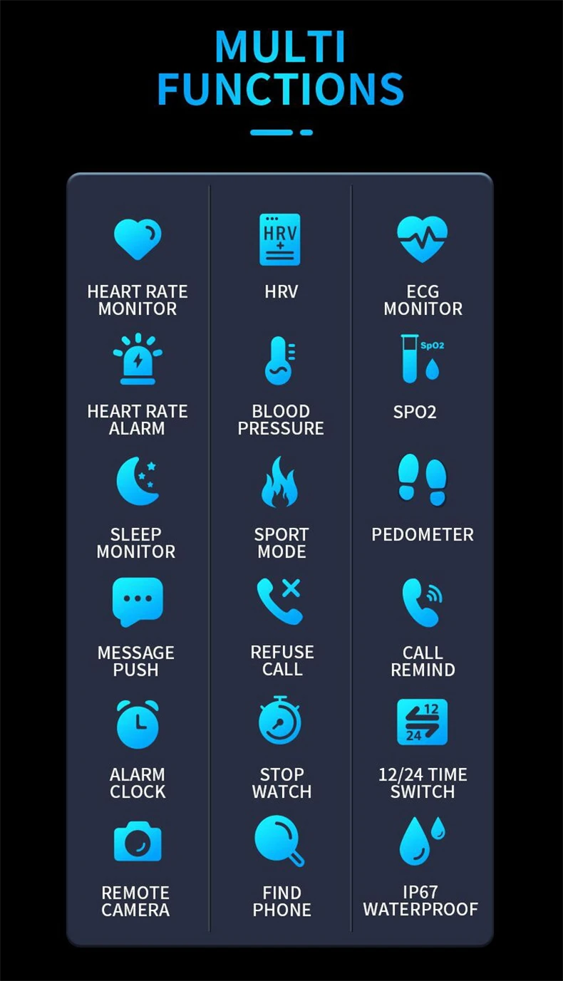 3. Многофункциональные функции: пульсометр, HRV, монитор ЭКГ, пульсометр, кровяное давление, SP02, монитор сна, спортивный режим, шагомер, Push сообщения, отказ от вызова, напоминания о звонках, будильник, секундомер, 12/24 переключатель времени, удаленная камера