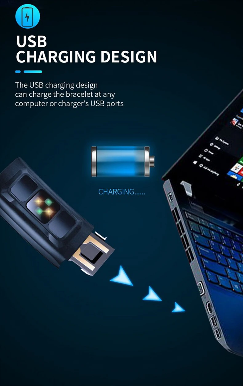 13. Дизайн зарядки USB: дизайн зарядки USB может заряжать браслет на любом компьютере или usb-портах зарядного устройства.