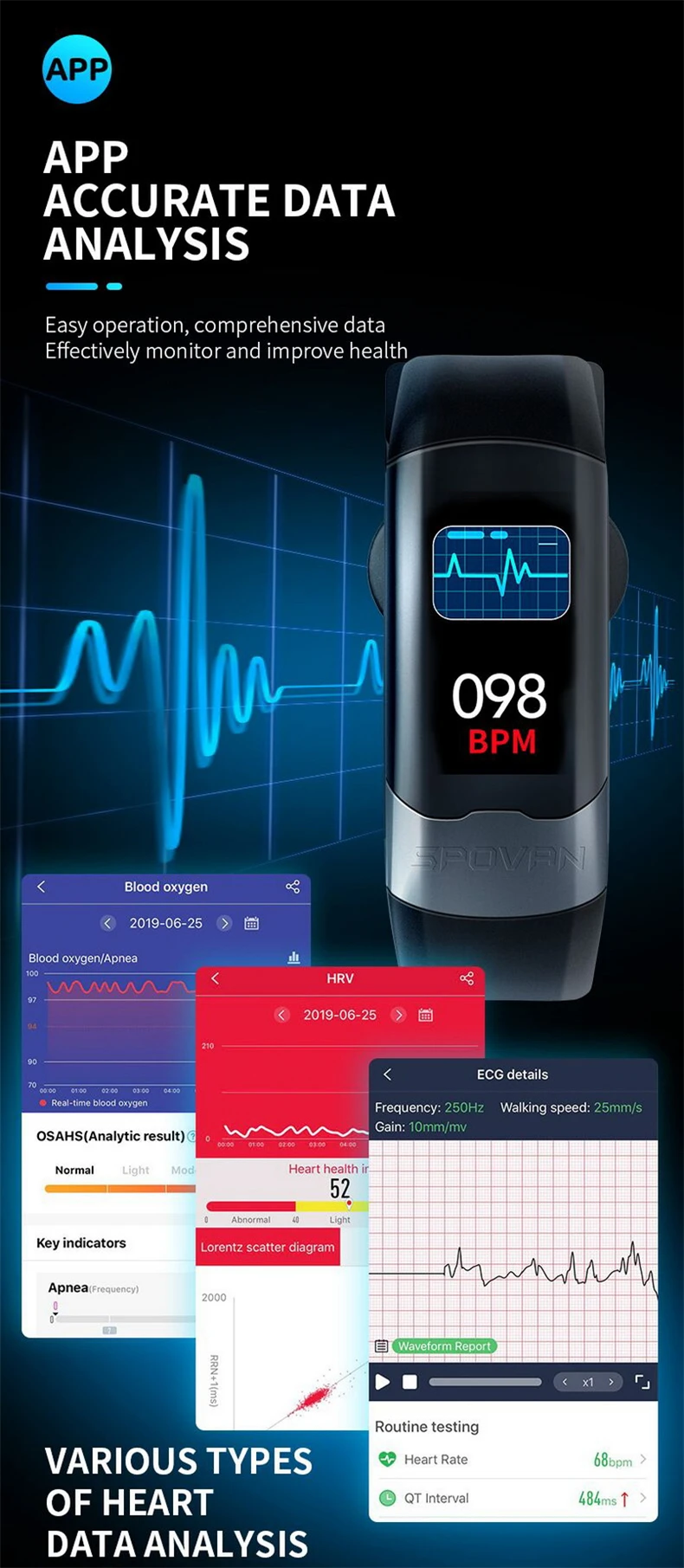 Спортивный смарт-браслет SPOVAN с функцией отслеживания ЭКГ, артериального давления, пульса, HRV, монитор сна, водонепроницаемый браслет, часы, часы