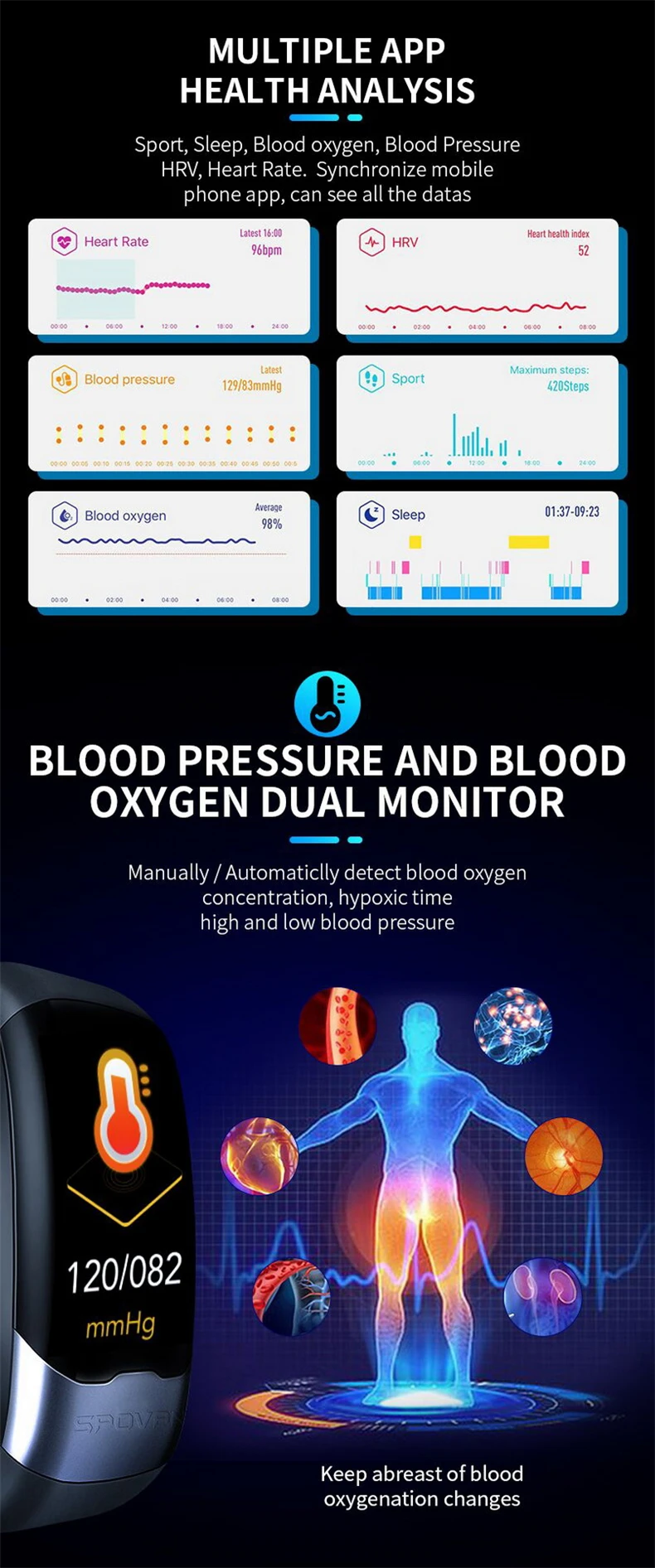 Спортивный смарт-браслет SPOVAN с трекером ЭКГ активности кровяного...