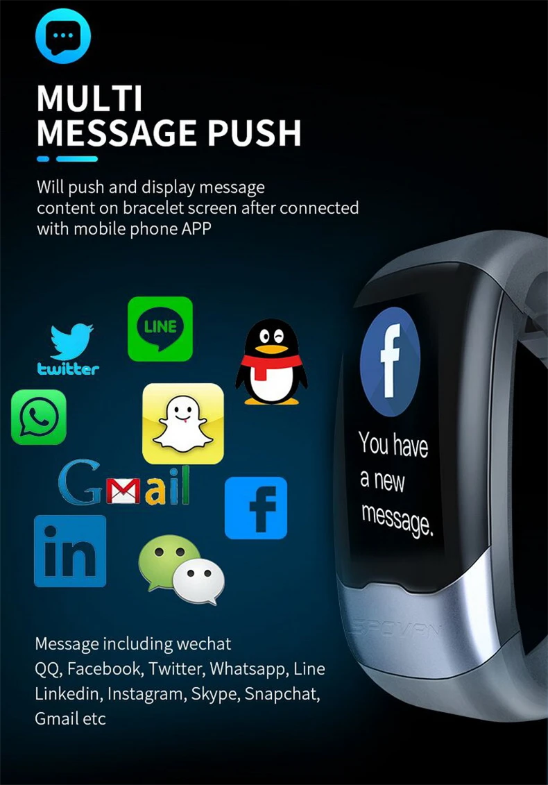 15.Multimessage Push: будет нажимать и отображать содержимое сообщения на экране браслета после подключения с приложением мобильный телефон. Сообщения, включая wechat,QQ, Facebook, Twitter, Whatsapp, Line,Linkedin,Instagram,Skype, Snapchat, Gmail и т. Д.