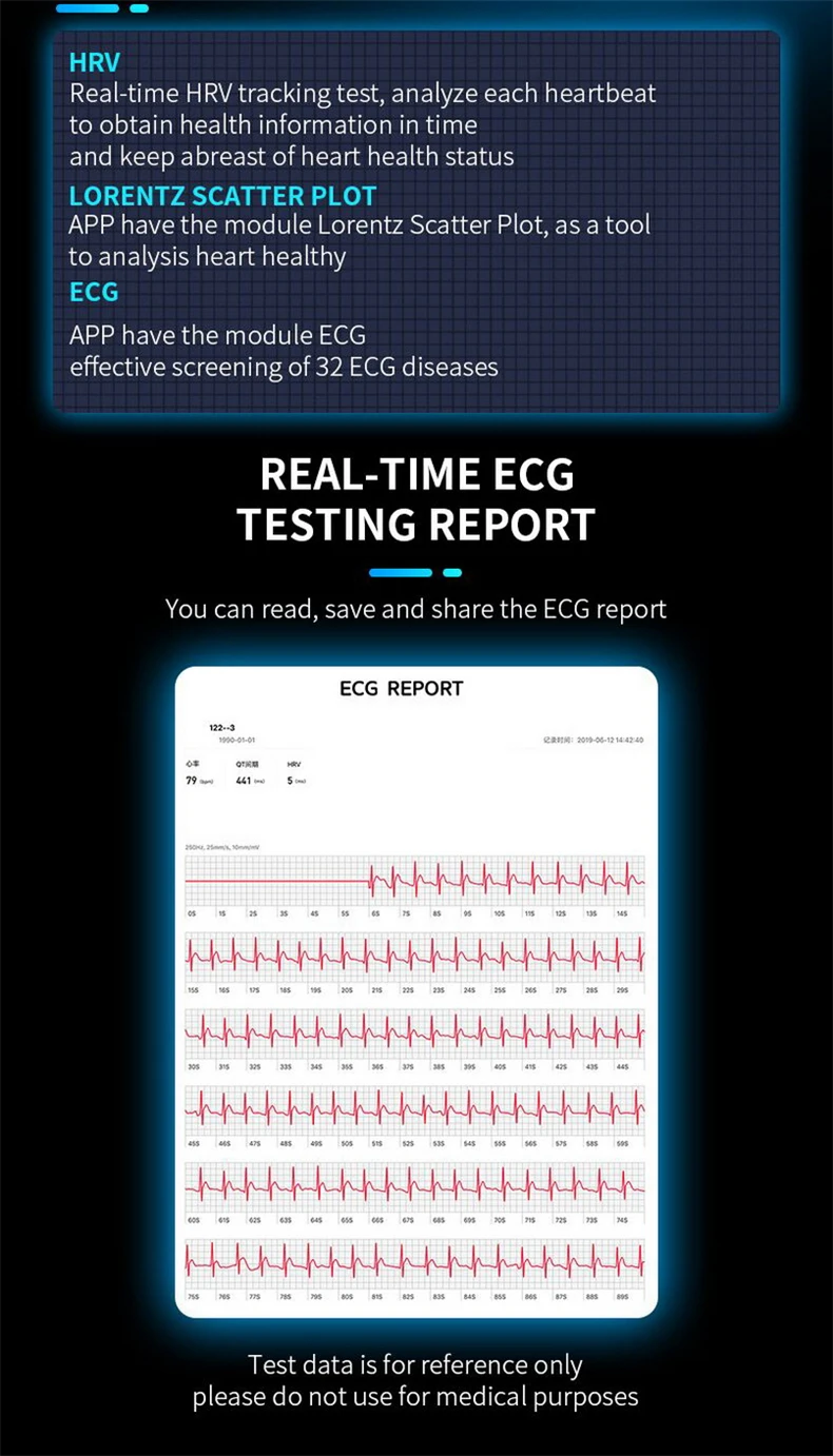 7. ЭКГ: приложение имеет модуль ЭКГ Эффективный скрининг 32 ECG заболеваний, в режиме реального времени ЭКГ тестирование отчет