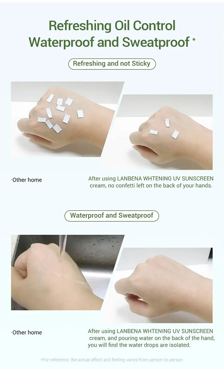 Освежающий и не липкийПосле использования солнцезащитного крема Lanbena никаких конфетти на тыльной стороне ваших рук не остается.Водонепроницаемый и устойчивый к потуПосле использования солнцезащитного крема Lanbena и заливки воды на тыльной стороне руки, вы обнаружите, что капли воды изолированы.Обеспечивает длительную защиту* Для справки, фактический эффект и чувство варьируется от человека к человеку