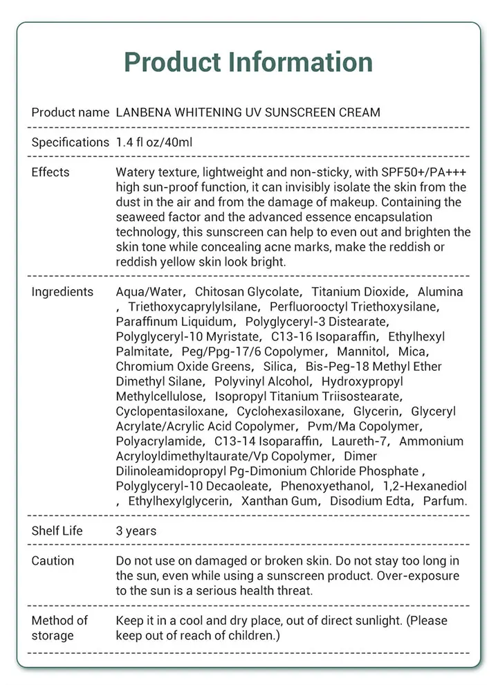 SPF50 + защита от солнечного светаОсвежающий, не жирный, и солнцезащитный эффект SPF50 + действительно долговечный. Солнцезащитный крем необходим во все сезоны. Я обязательно куплю крем Lanbena Suncreen."--- ГрацияНеобходимо для ленивых людейЭто второй раз, когда я покупаю его, и он очень хорош в использовании. Цвет отлично подходит к тону кожи, и вы можете вытереть, когда идете на прогулку ~"--- Joy