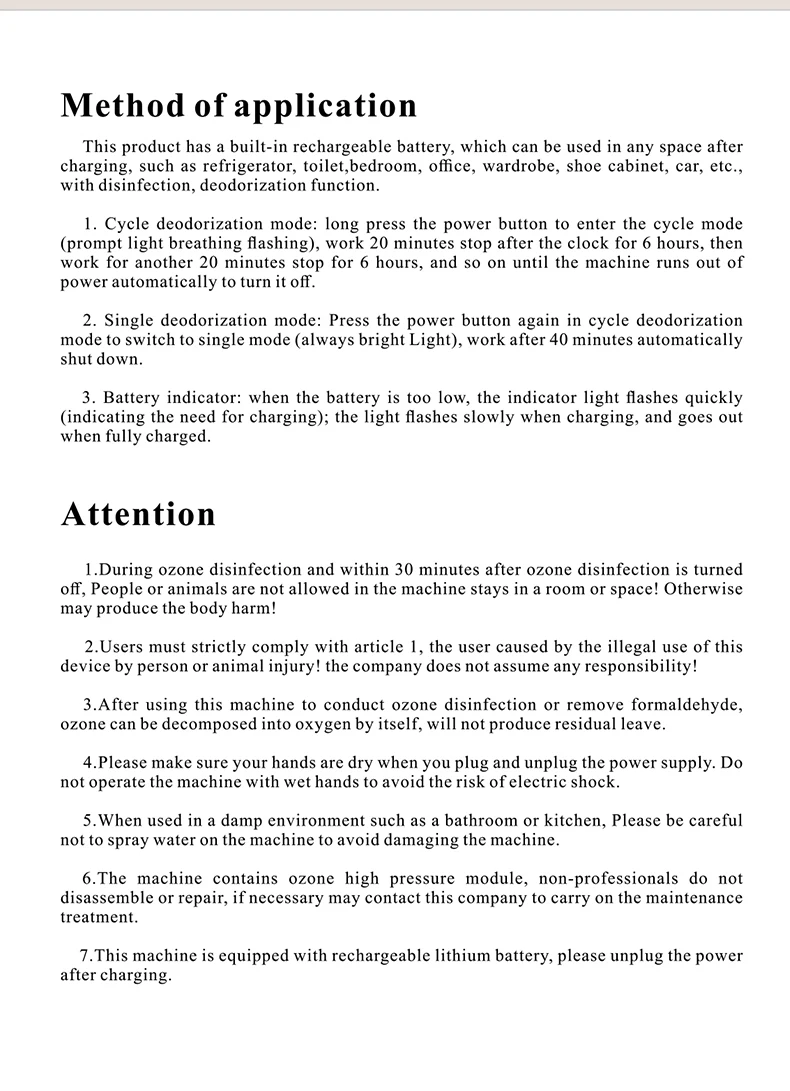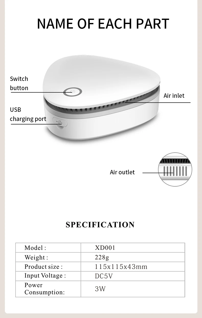 1. Мини-размер, легко носить с собой, вы можете использовать его в любом месте, например, в машине/шкафах для обуви/шкафах/носках/коробках для нижнего белья и так далее;2. USB зарядка, подключи и играй, компьютер и внешний аккумулятор могут заряжать для него;3. Есть три режима: утилизация озона/нормального высвобождения озона/сильная зона высвобождения, вы можете выбрать его в соответствии с вашими потребностями;4. Функции: стерилизация озона, энергосбережение и низкое потребление, легкое дезодорирование, дезинфекция и стерилизация, разложение формальдегида, удаление запахов, очистка воздуха, предотвращение плесени и дезодорирования, И сохраняет обновления в течение длительного времени.