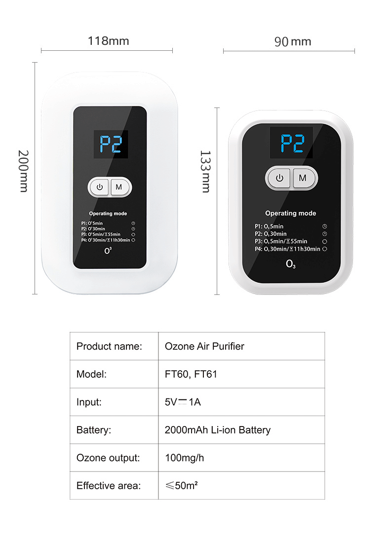 Батарея: 1 * литиевая батарея, 1800 мАч (в комплекте)Номинальный вход: постоянный ток 5 ВНоминальная мощность: 3 ВтКоличество озона: 60 мг озона в часРазмер упаковки: 140*133*44 мм/5,5*5,2 * 1.7in