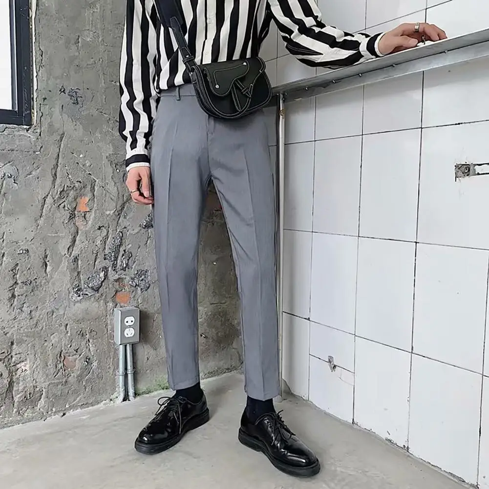 Повседневные модные прямые брюки с высокой талией, мужские костюмные брюки, однотонные прямые брюки со средней посадкой и карманами для работы, слаксы