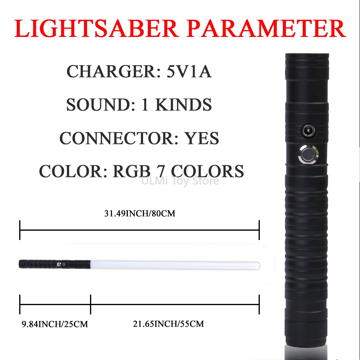 Материал: алюминиевый сплав, высококачественный ПКОбщая длина: 31,49 дюйма/80 смДлина ручки: 9,84 дюйма/25 смДлина лезвия: 21,65 дюйма/59 смДиаметр: 1 дюйм/3 смЗвук: 1 вид звуковЦвет лезвия: 7 цветов (красный, желтый, зеленый, голубой, синий, розовый, белый)Цвет ручки: черныйВремя зарядки: 2-3 часаНапряжение зарядки: 5 В/1 А (макс.)Батарея: 18650 3,7 VЕмкость аккумулятора: 1200 мАчИзюминка: 3*1 ВтЗарядное устройство: 5V1AРазъем: Да