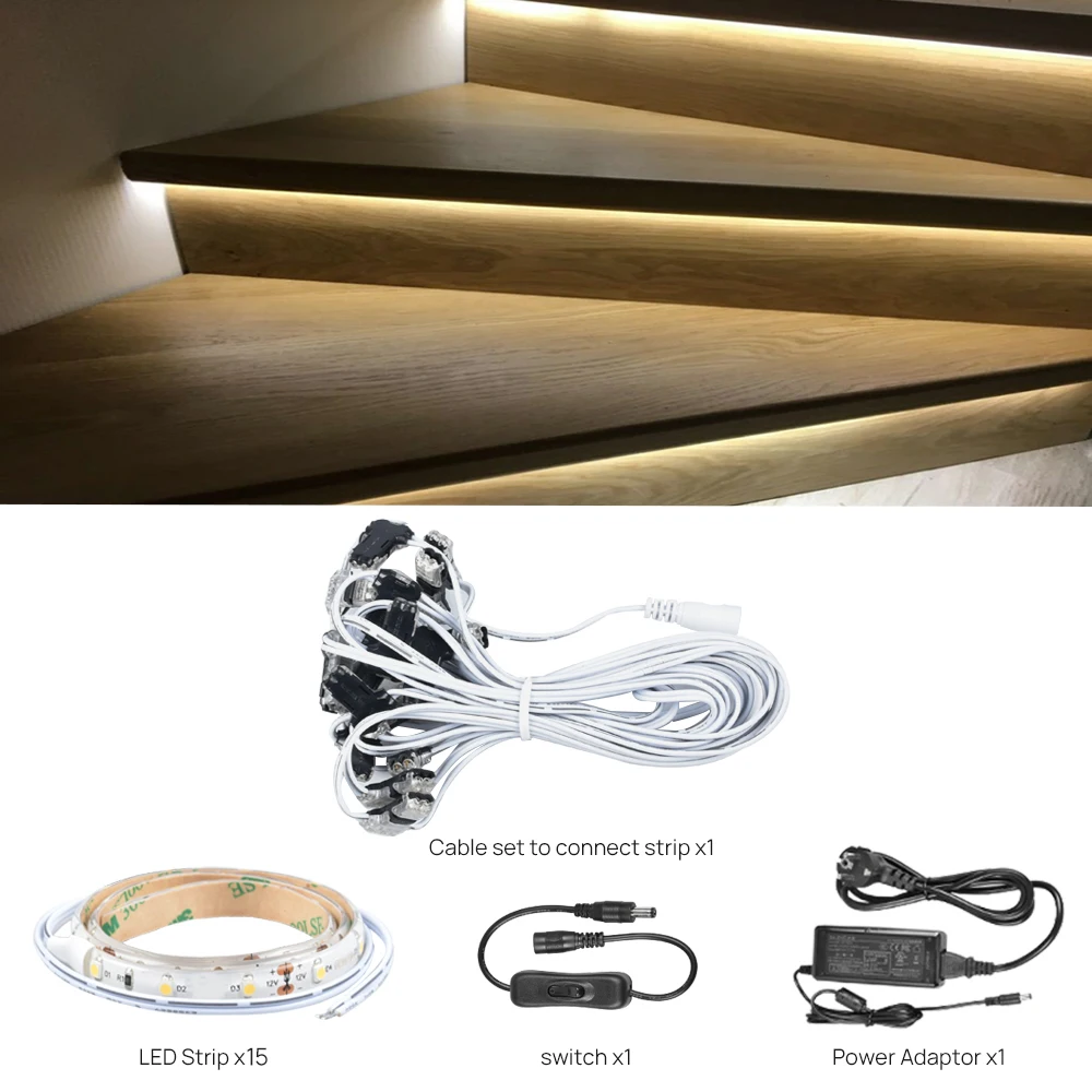 15 шагов, теплый белый свет, 0,5 м, система освещения лестницы со светодиодной лентой, Plug and Play