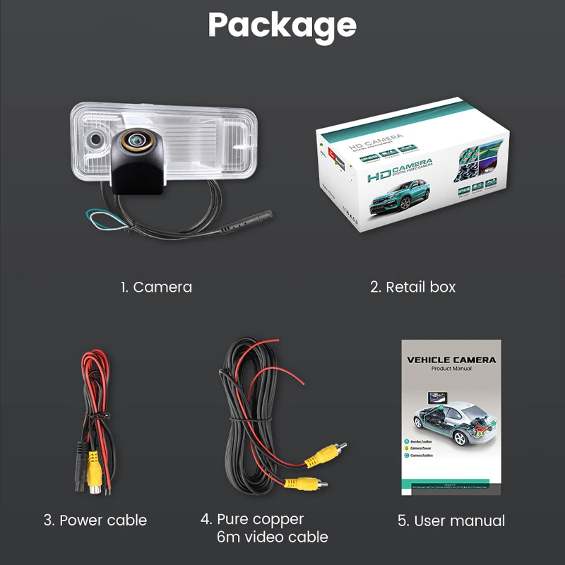 1. Камера заднего вида2. Розничная коробка3. Кабель питания4. Чистый медный 6 м видео кабель5. Руководство пользователя