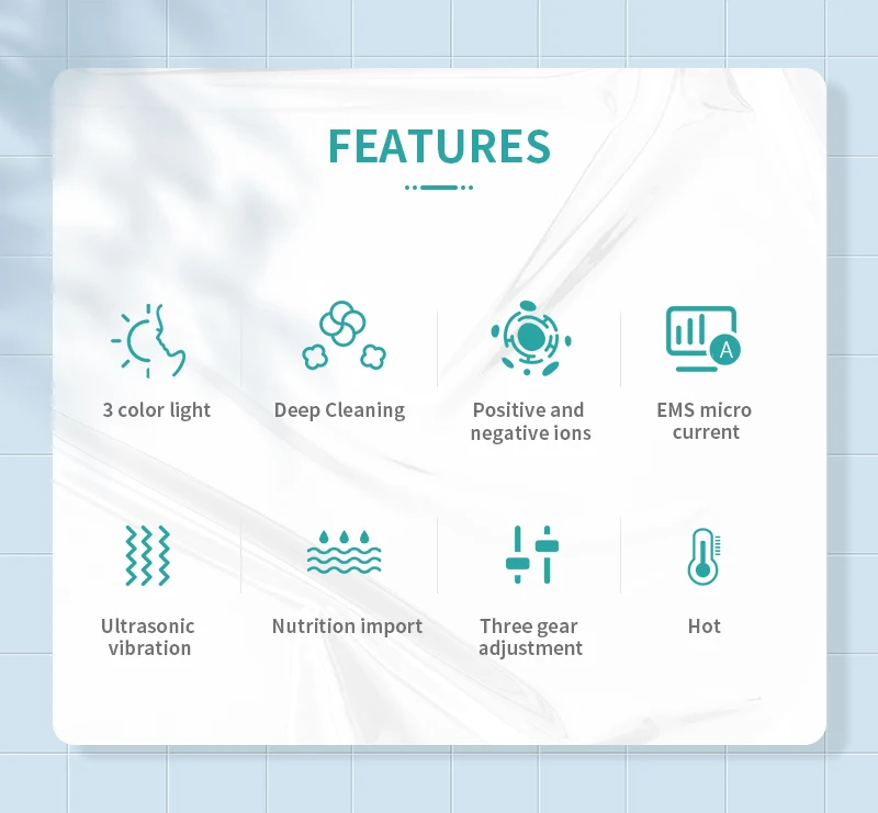 ①Positive and negative ions: utilize the principle of the absorption of positive and negative ions to remove the dirt in the deep pores andthoroughly clean them; through iontophoresis, the beauty ingredients are penetrated into the skin.②Vibration:use mechanical vibration and voltage stimulation to tighten skin, increase elasticity, and increase metabolism.③Warm:warm massage promotes absorption, so that wrinklescan be stretched and skin will become fuller.④Red light: can effectively stimulate the skin, revitalize collagen, improve dark skin and reduce fine lines and wrinkles.⑤Blue light:It can effectively improve skin problems, reduce acne and pimple and help to kill bacteria. Long term use can make skin rejuvenation and lead to a health skin.⑥Green light:It can promote the microcirculation of the body surface, dredge lymph and drain swelling.
