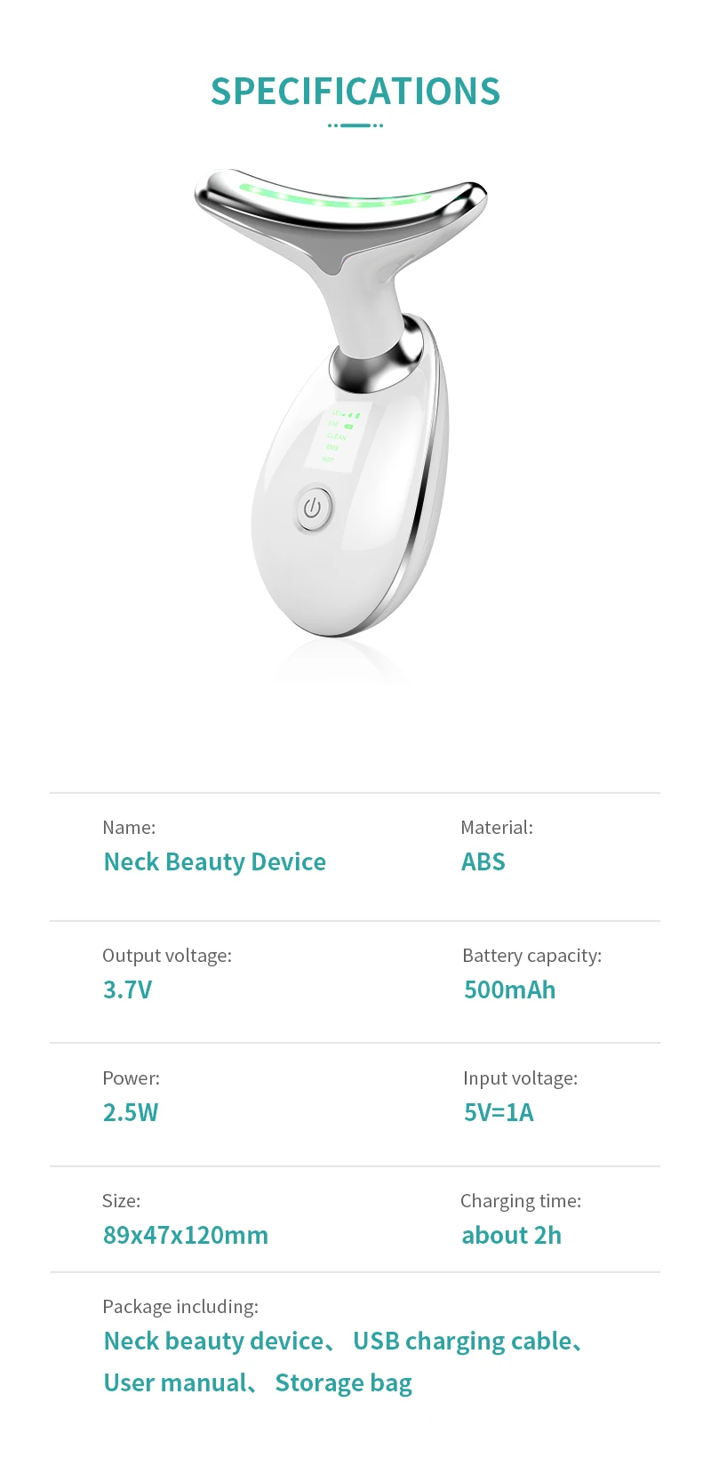Name: Neck Beauty DeviceMaterial: ABSOutput voltage: 3.7VBattery capacity: 500mAhPower: 2.5WInput voltage: 5V=1ASize: 89x47x120mmAuto turn off: about 5 minCharging time: about 2h