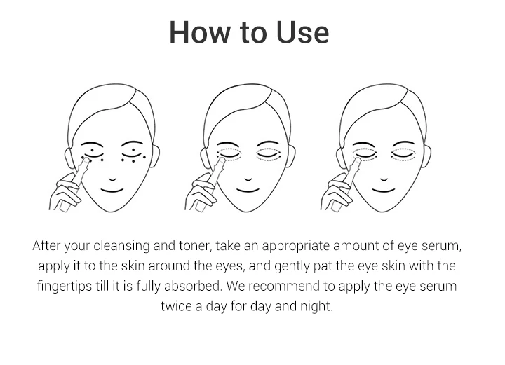 После очищения и тонера Возьмите необходимое количество сыворотки для глаз, нанесите на кожу вокруг глаз и аккуратно погладьте кожу вокруг глаз кончиками пальцев до полного впитывания. Мы рекомендуем наносить сыворотку для глаз дважды в день и на ночь.