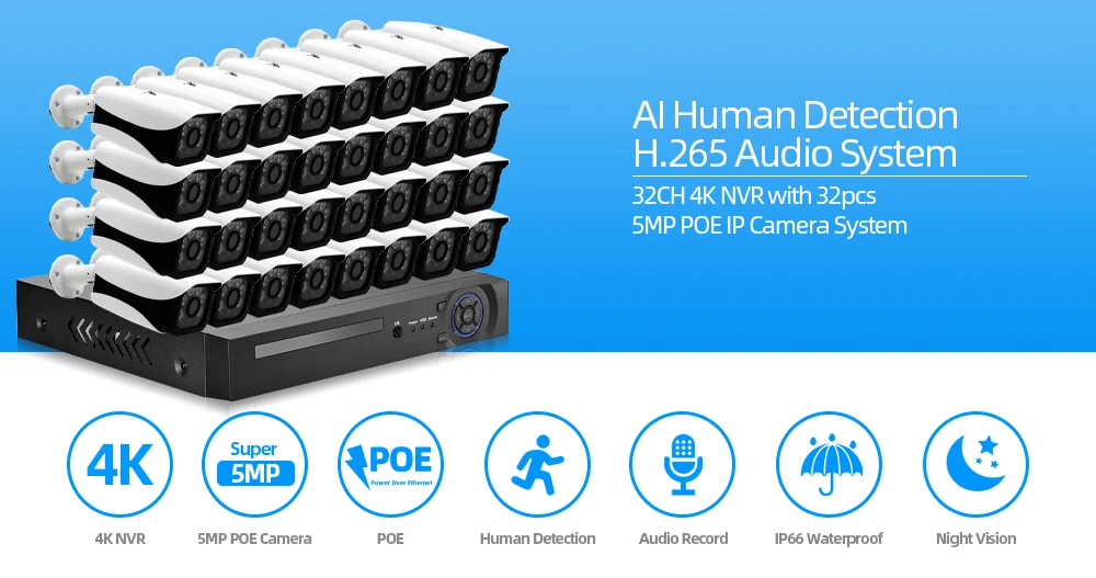 H.265 32CH 5MP POE камера видеонаблюдения системы безопасности комплект 4K NVR наружная Водонепроницаемая Пуля IP камера видеонаблюдения Система Комплект 24CH