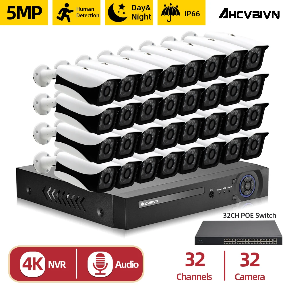 1X32 канальный сетевой видеорегистратор 4K NVR;16/24/32 x HD 5.0MP POE IP для помещений и улицы ИК-камеры дневного ночного видения с защитой от атмосферных воздействий;1 x Переключатель 16/ 24CH/32CH POE1 источник питания для коммутатора POE1 блок питания для сетевого видеорегистратора;1 USB-мышь для сетевого видеорегистратора;1 компакт-диск с программным обеспечением для сетевого видеорегистратора;1 х пульт дистанционного управления для сетевого видеорегистратора;Жесткий диск опционально!
