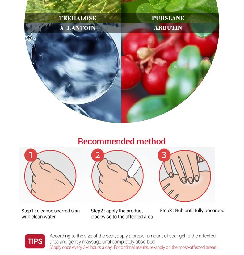 Шаг 1: Очистите ожоженную кожу чистой водой Шаг 2: нанесите изделие по часовой стрелке на пораженный участок Шаг 3: втирать до полного впитывания Советы: в соответствии с размером шрамов, нанесите необходимое количество геля на пораженный участок и Аккуратно помассируйте до полного впитывания (Применяется каждые 3-4 часа в день. Для получения дополнительных результатов нанесите повторно на наиболее пострадавшие участки)