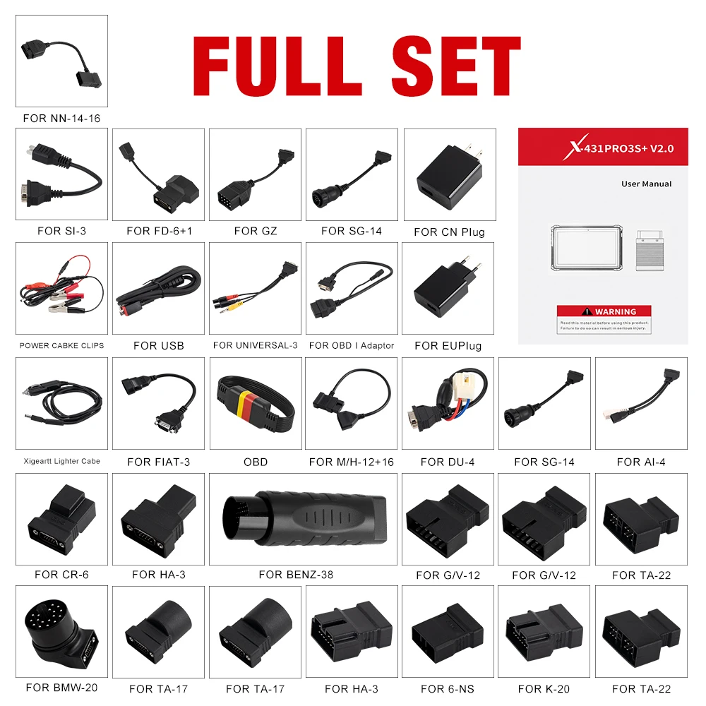 1. Videoscope (в основном применяется для проверки невидимых частей двигателя, топливного бака, тормозной системы и т. Д.)2. TSGUN (активирует все датчики, tpms relearn, программирует только датчики запуска)3. X431 PRO G 3(IMMO для VAG Group выше 3,5)4. X431 Сверхмощный модуль (Диагностика бензиновых транспортных средств и дизельных грузовиков 24 В)5. X431 ADAS Moblie/ADAS PRO (калибровка широкого спектра систем помощи водителю на основе камеры и радаров)6. X431 принтер (печать диагностических данных/отчетов.)