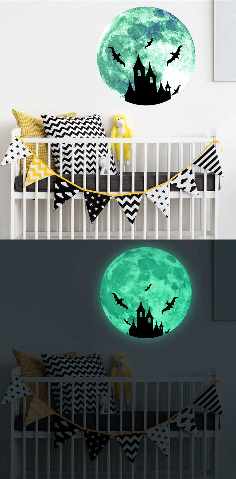 Светящиеся наклейки на стену в виде планеты, призрака, волка, летучей мыши, замка, Мультяшные флуоресцентные наклейки, украшение детской комнаты, наклейки с зеленсветильник том