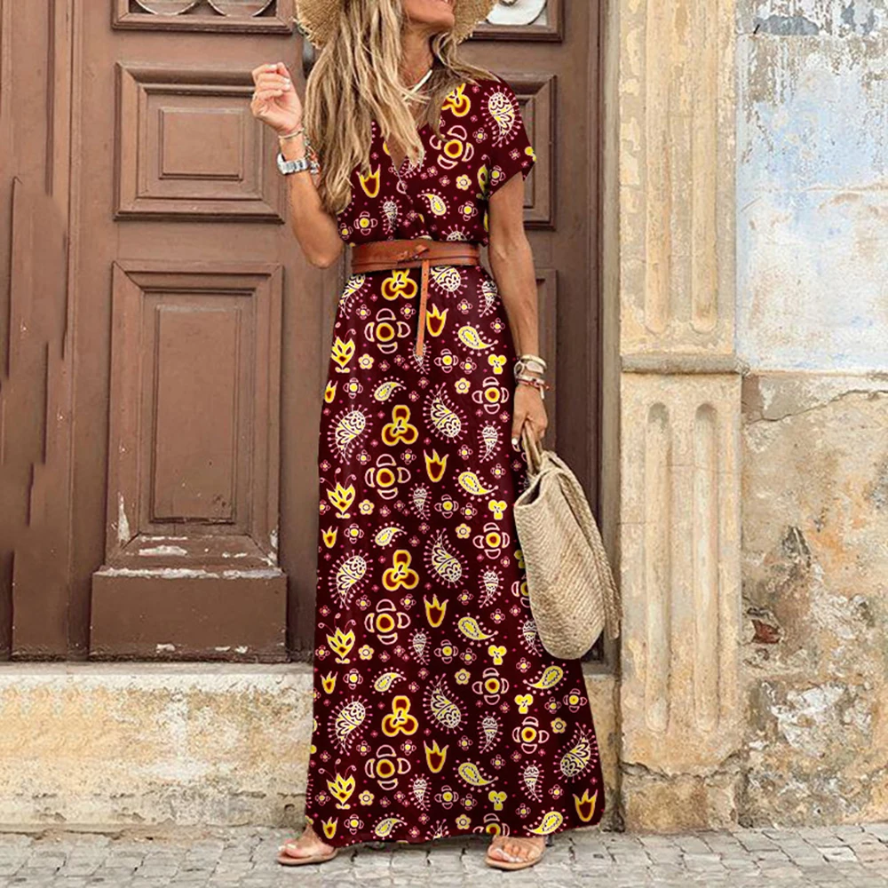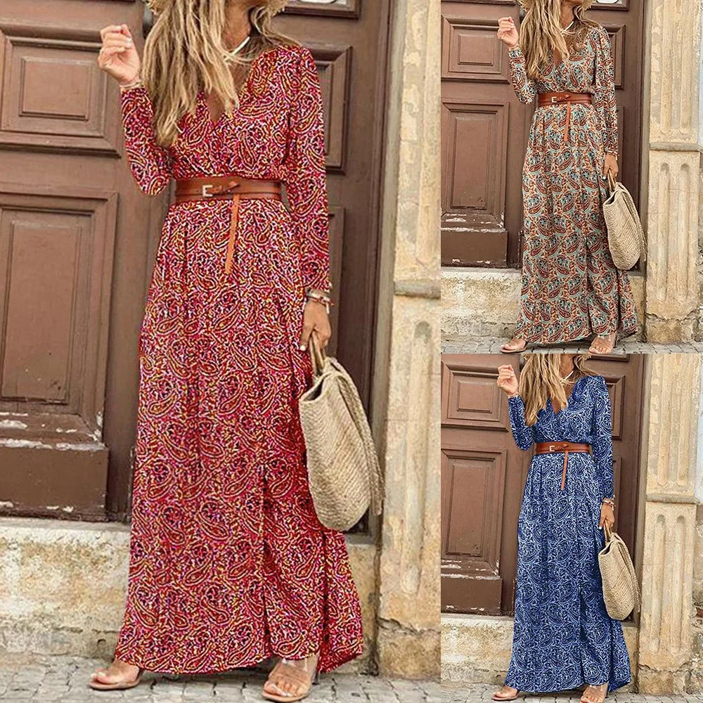 Женское длинное платье с V-образным вырезом, летнее богемное Платье макси с поясом, повседневное сексуальное праздвечерние чное платье, женский пляжный праздничный сарафан 2021