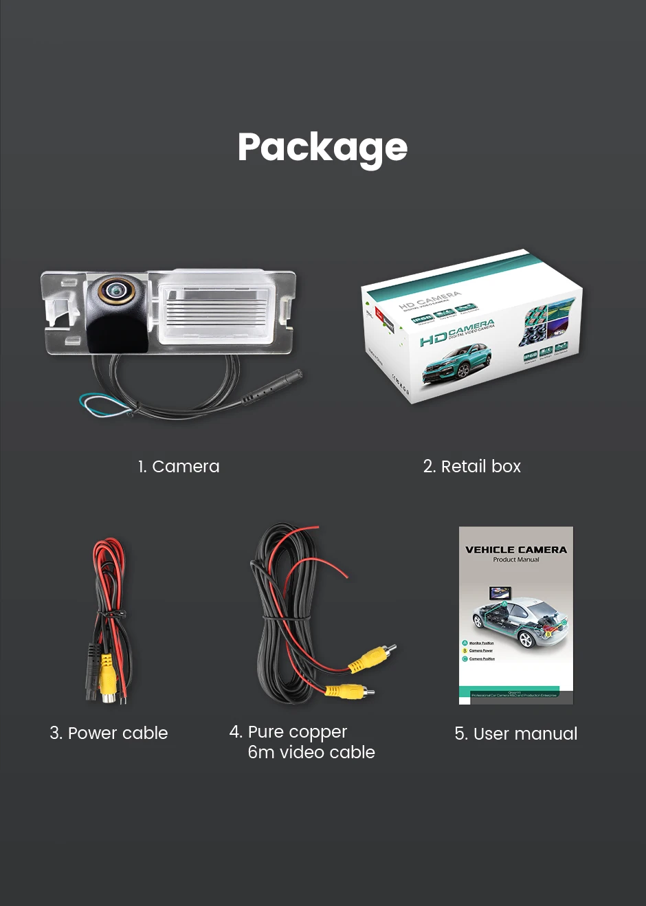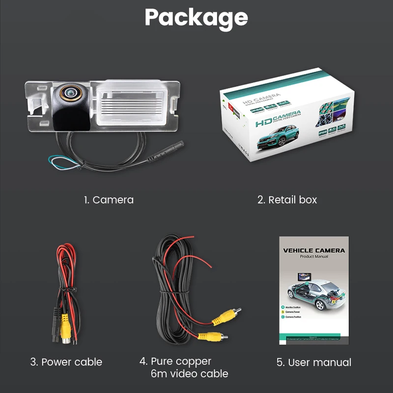 1. Камера заднего вида2. Розничная коробка3. Кабель питания4. Чистый медный 6 м видео кабель5. Руководство пользователя